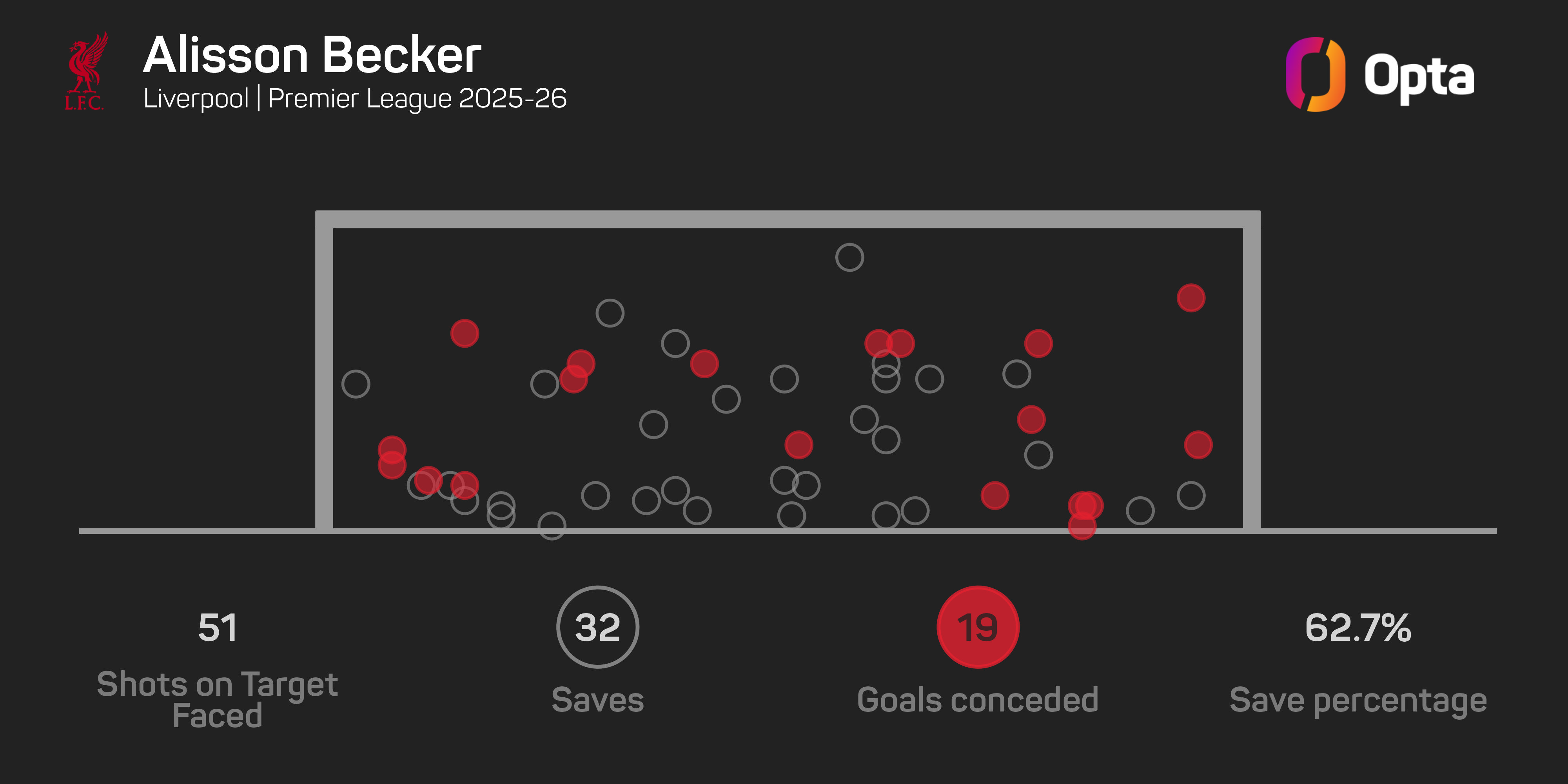 In fact, Alisson's save percentage is also down at 62.7%. Across his Premier League career prior to this campaign, his save percentage average was 73%.