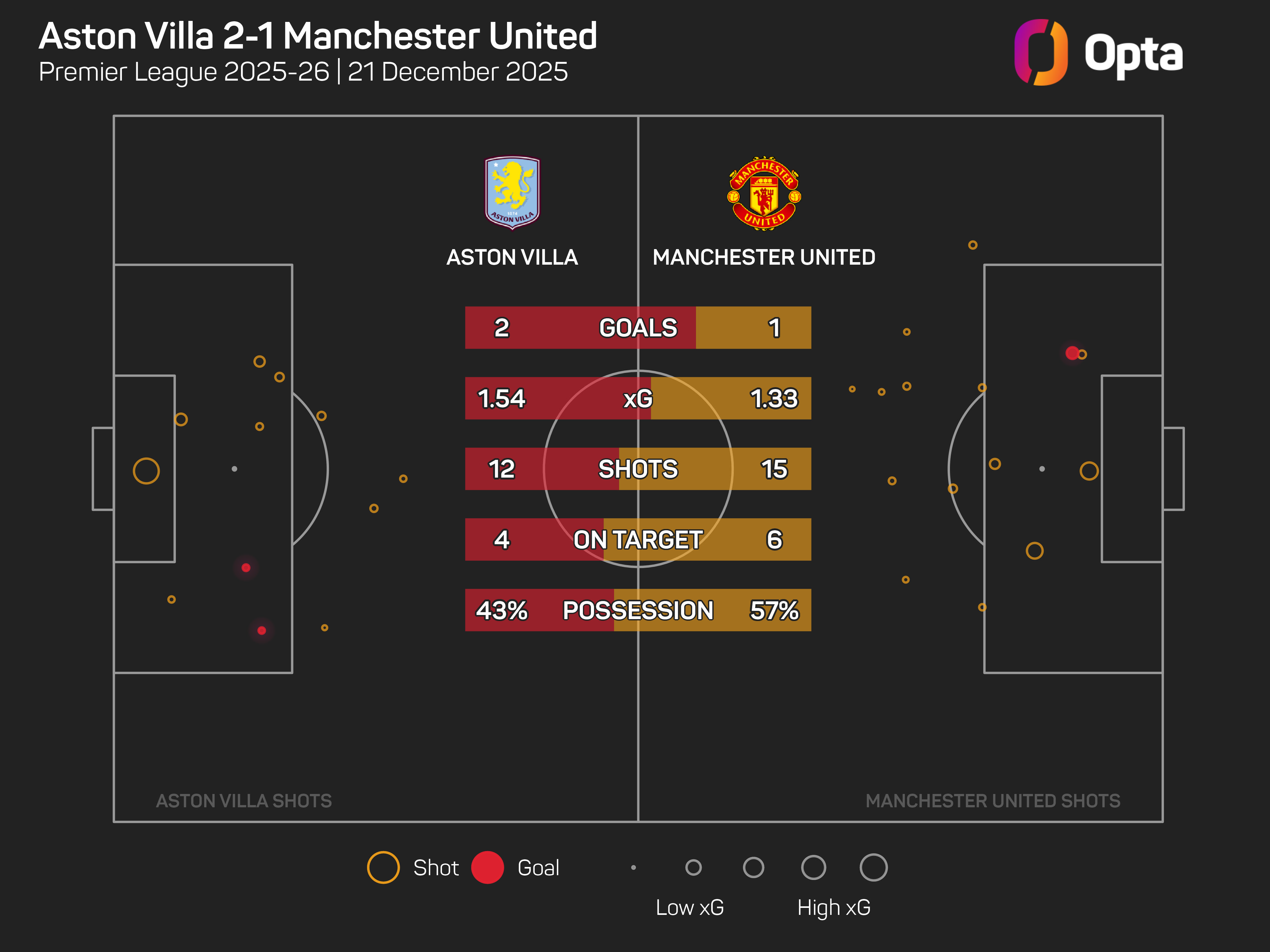 Amorim's side, who lost Bruno Fernandes to injury at half-time, edged the expected goals (xG) battle, with 1.3 to Villa's 1.0, and had 15 attempts, six of which were on target. Their hosts had 12 shots.