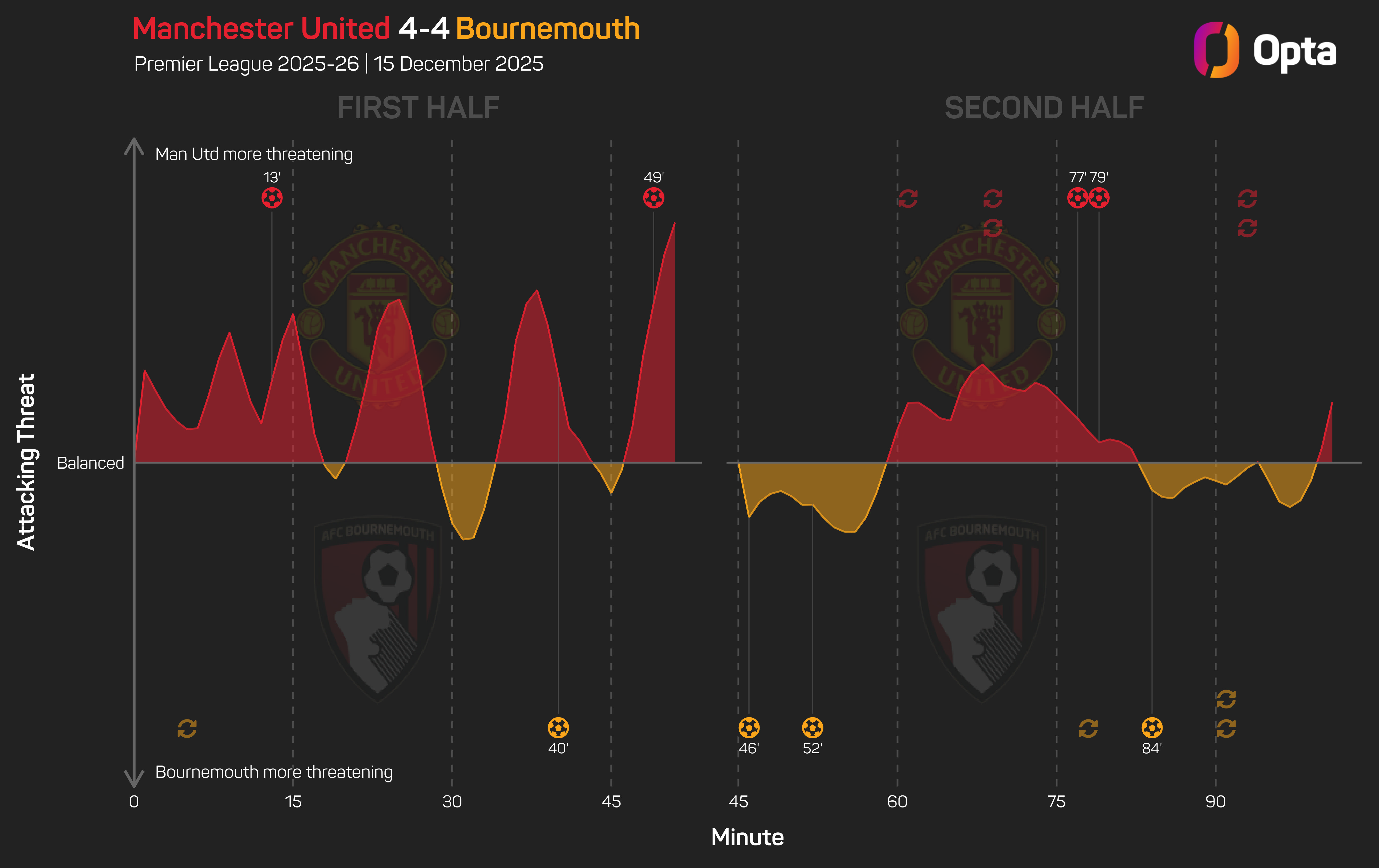 The Red Devils had 17 shots, 2.49 non-penalty expected goals (xG) and 30 touches in Bournemouth's area before half-time, with each of those figures being the most by any team in a Premier League match this campaign.