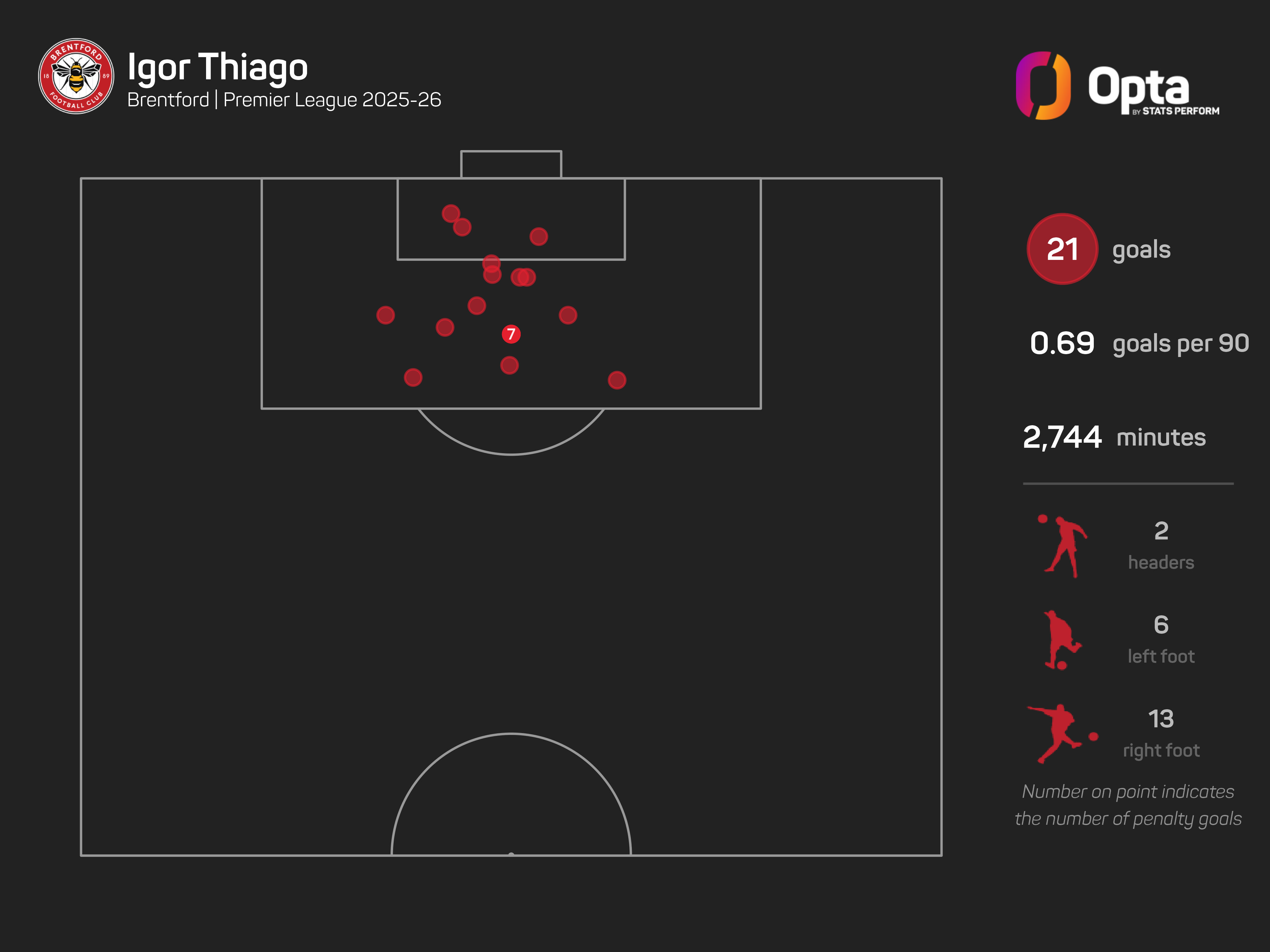 Only Manchester City's Erling Haaland (22) has scored more Premier League goals this season than Brentford's Thiago (21).