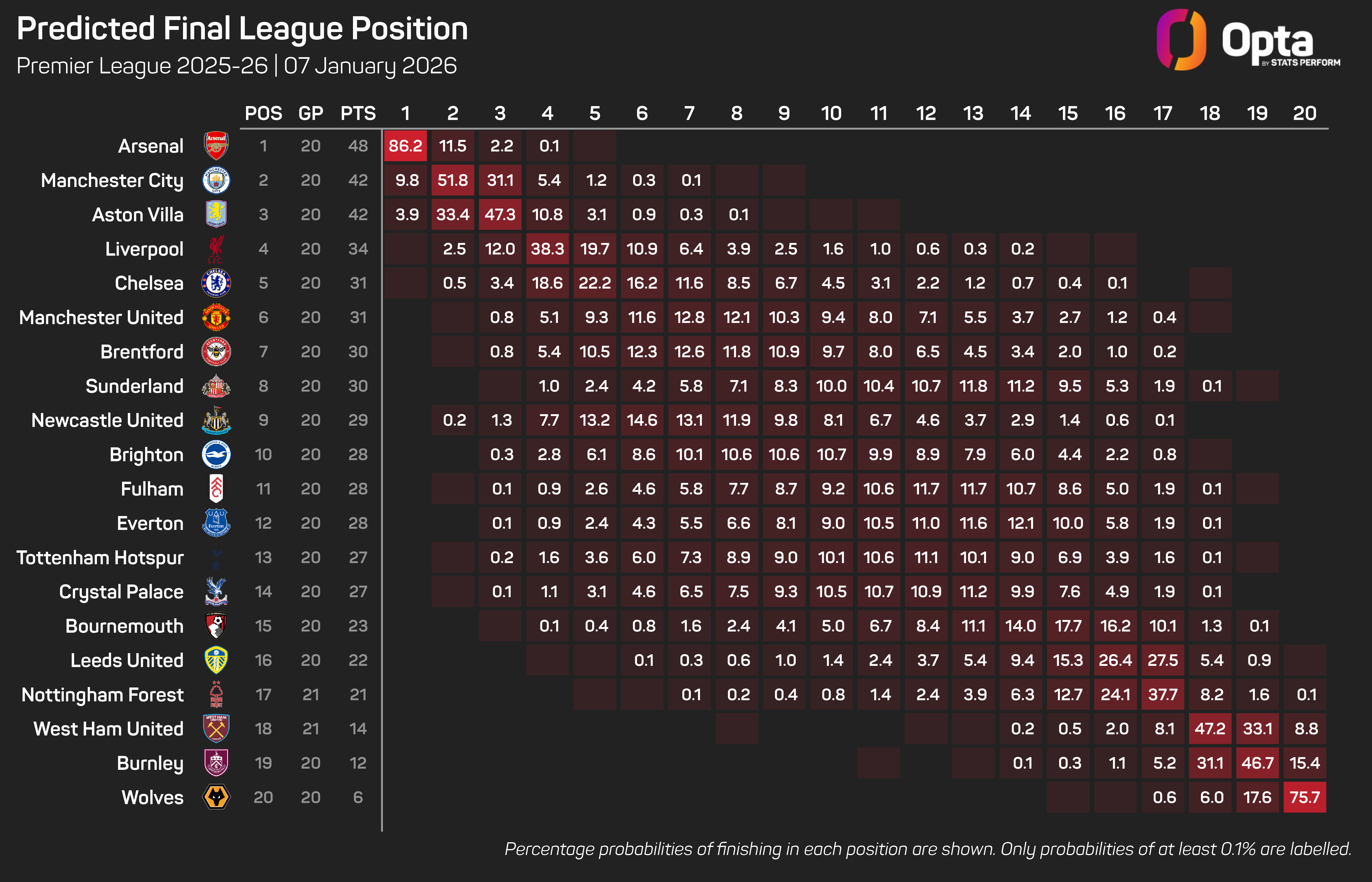 Arsenal are assigned an 86.2% chance of sitting top of the pile according to the Opta supercomputer, with only Manchester City (9.8%) and Aston Villa (3.9%) believed to be in with a chance of lifting the title this season in its simulations.