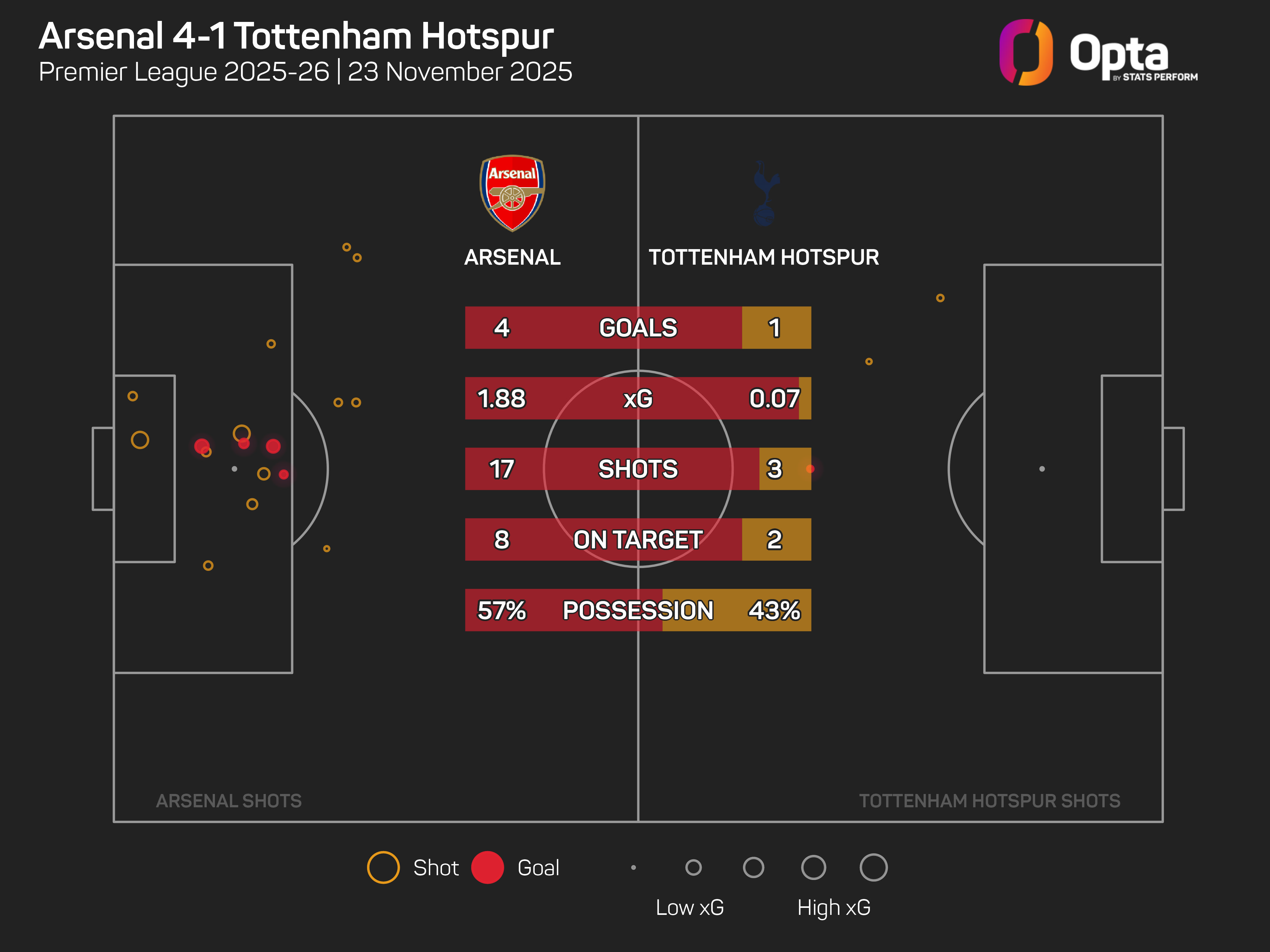 The Gunners have now won each of their last four league games against Tottenham, only enjoying longer runs in August 1980 (six wins) and January 1989 (five wins).