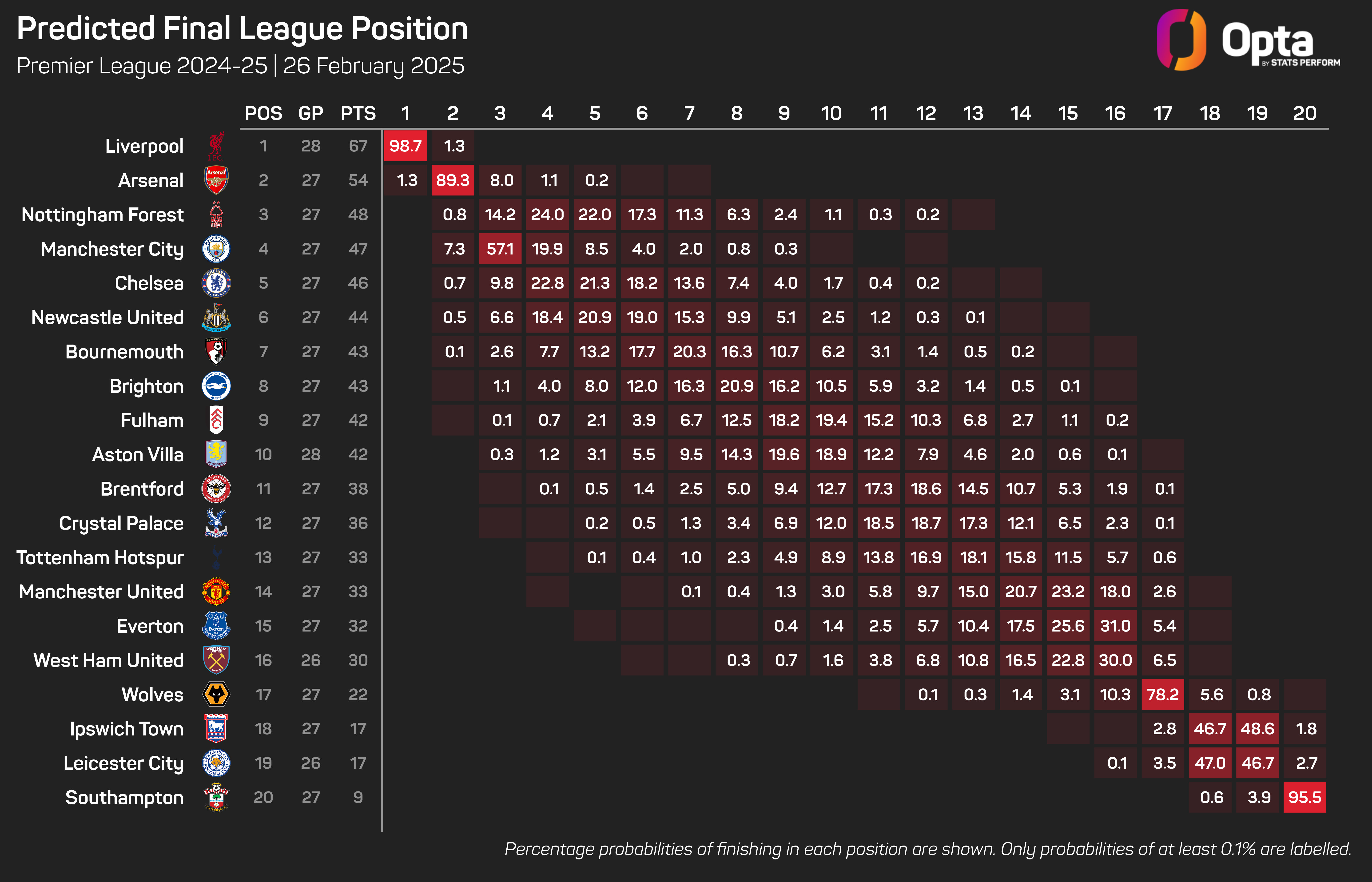 Arteta said he would continue to fight for the title, but the Reds now win the 2024-25 Premier League crown in 98.7% of the Opta supercomputer simulations, to Arsenal's 1.3%.