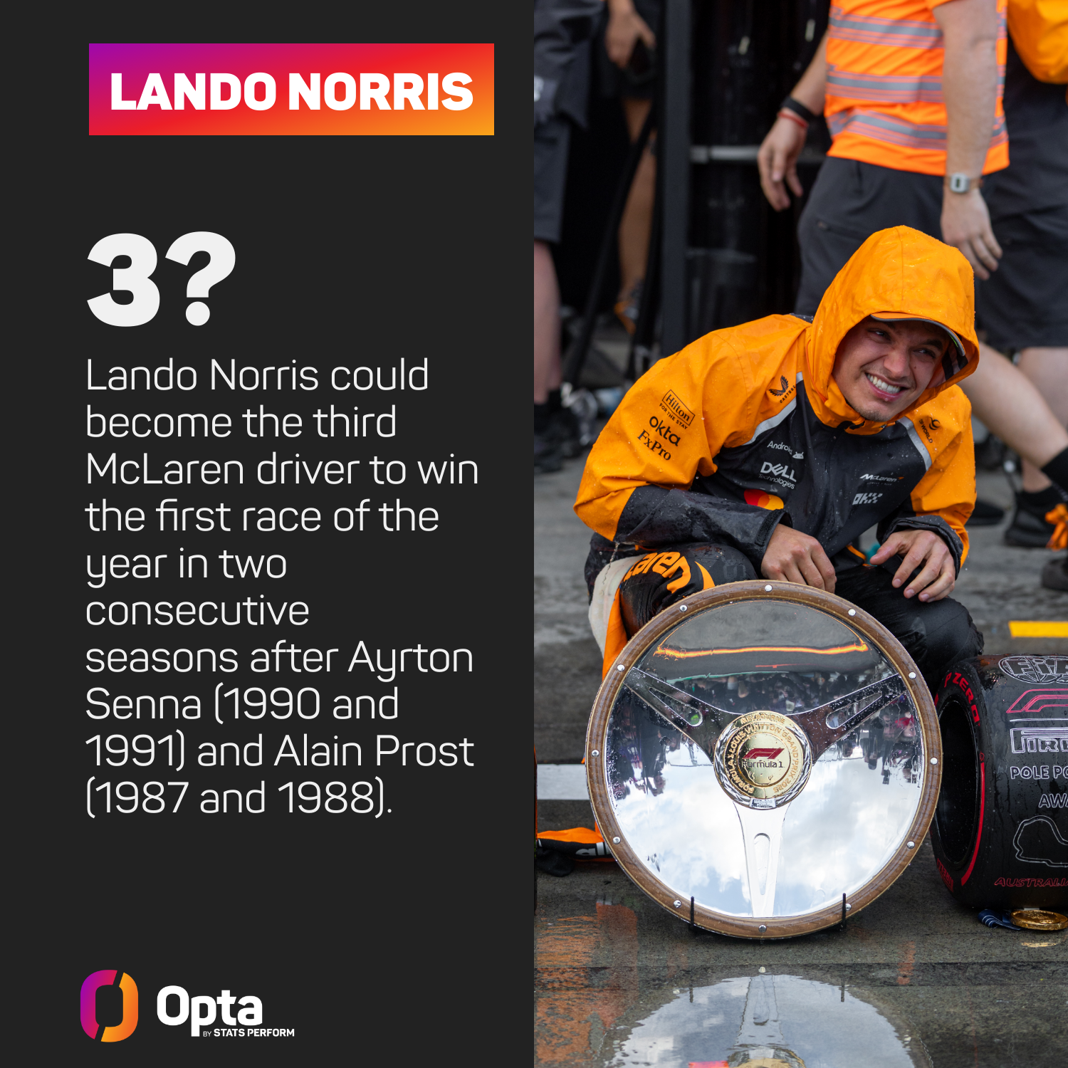 He could also become the third McLaren driver to win the first race of the year in two consecutive seasons, after Ayrton Senna (1990 and 1991) and Alain Prost (1987 and 1988).