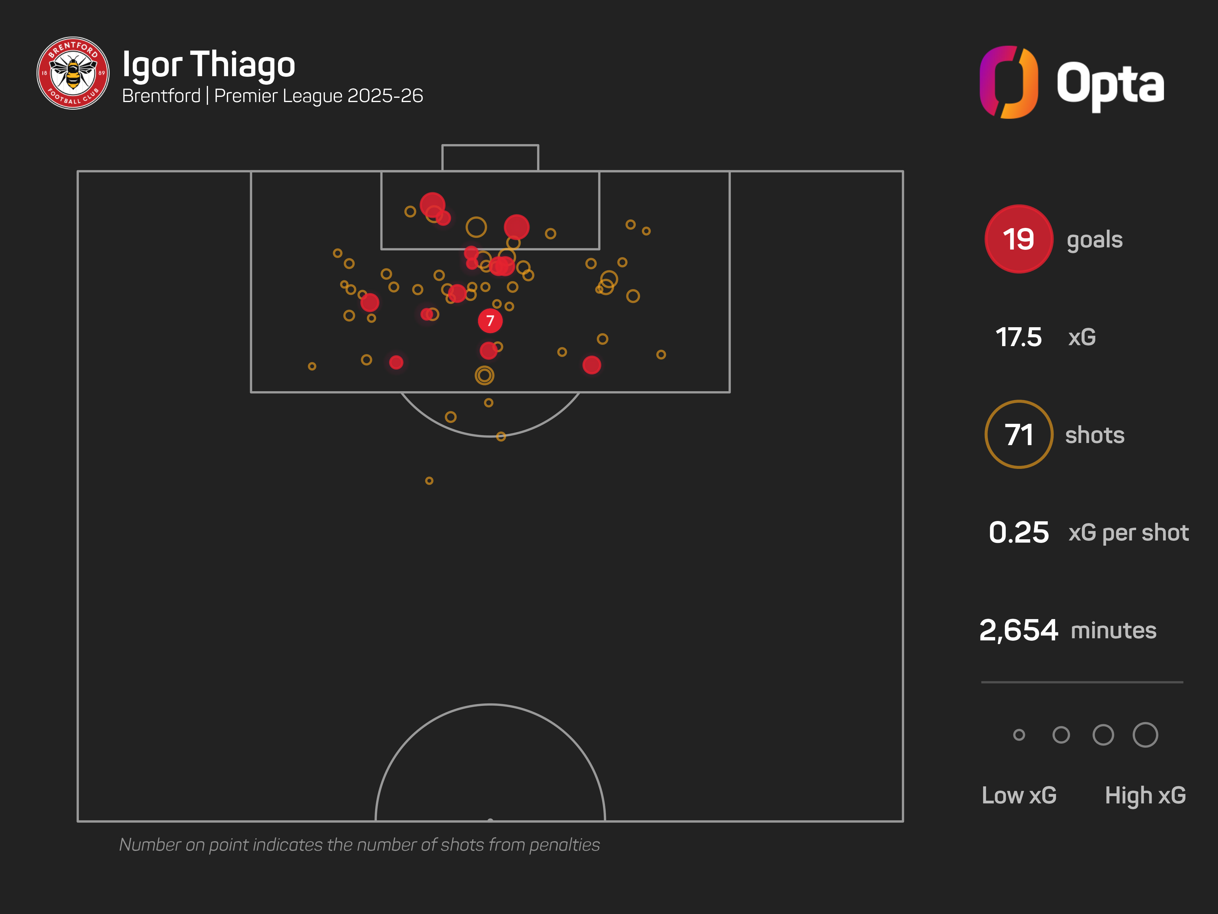 Thiago's 19 Premier League goals this term have come from an expected goals (xG) figure of 17.5, while he has hit the target with 63.8% of his shots (37/71) and boasts a 26.8% conversion rate.