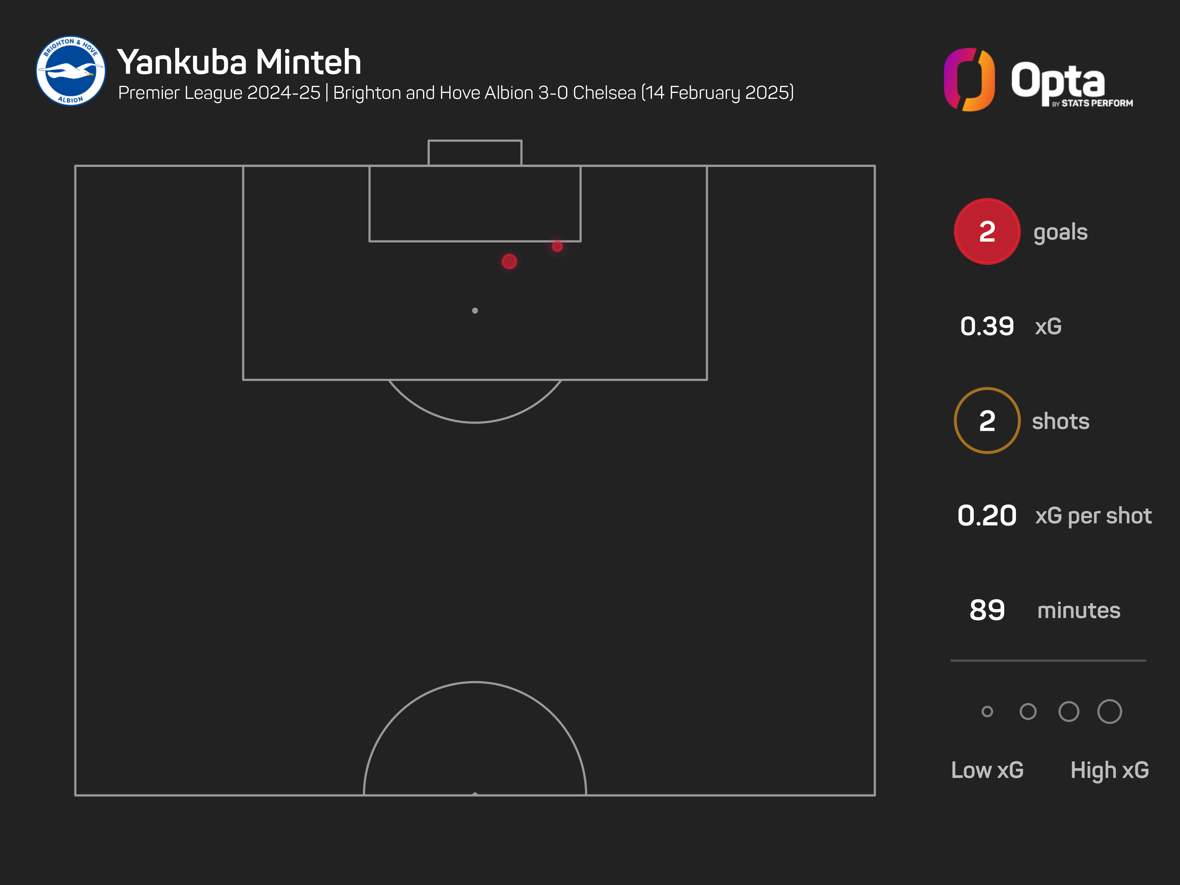 Minteh bagged his first-ever brace in English football, while he has been directly involved in four goals in his last four Premier League games (three goals, one assist), one more than in his first 16 outings in the competition combined (three).