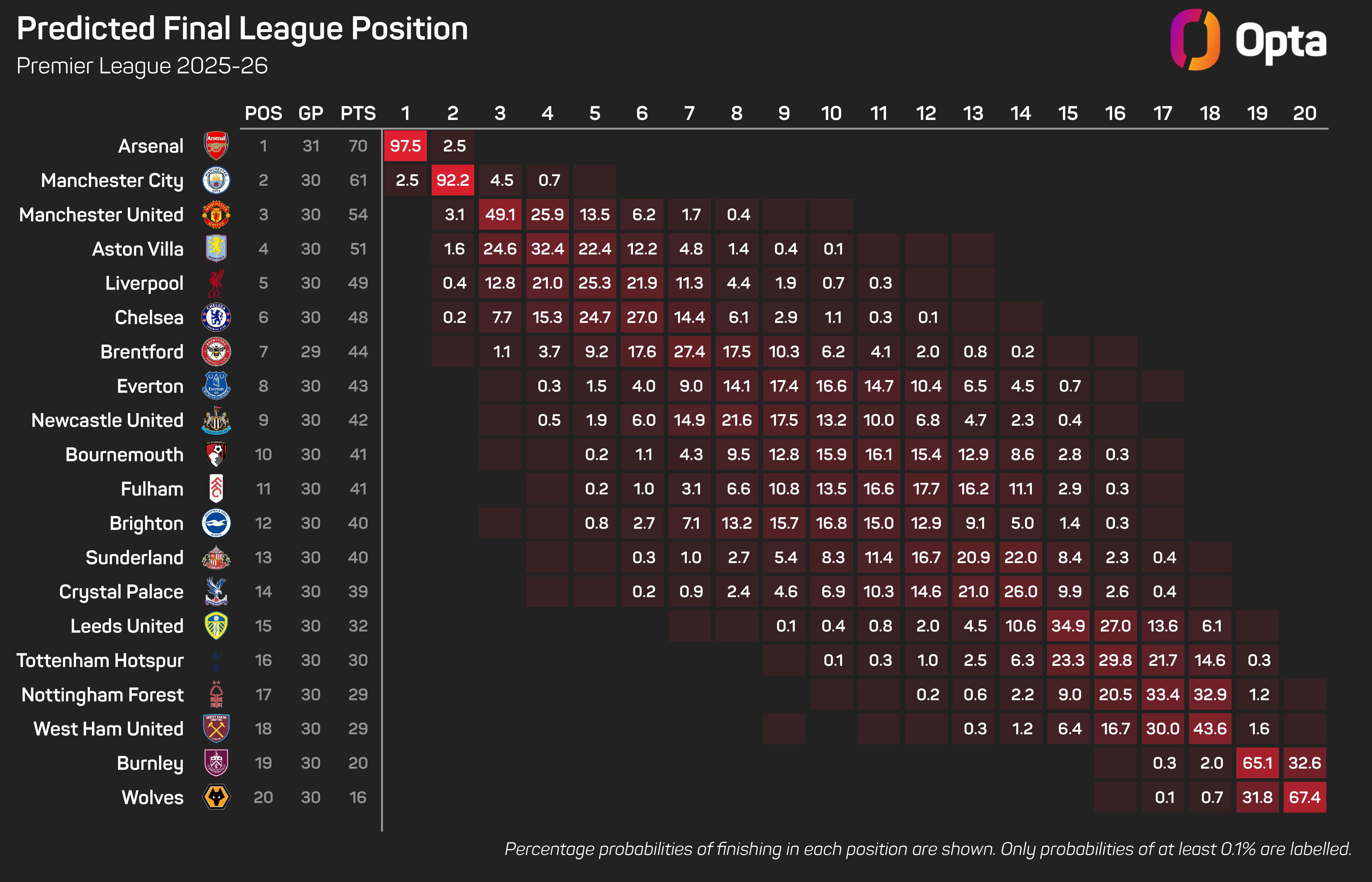 And that Achilles heel has seen the Opta supercomputer give them a 34.2% chance of finishing in the top four, though a fifth-placed finish looks likely to see them qualify for UEFA's flagship competition, which bumps up their probability to 59.5%.