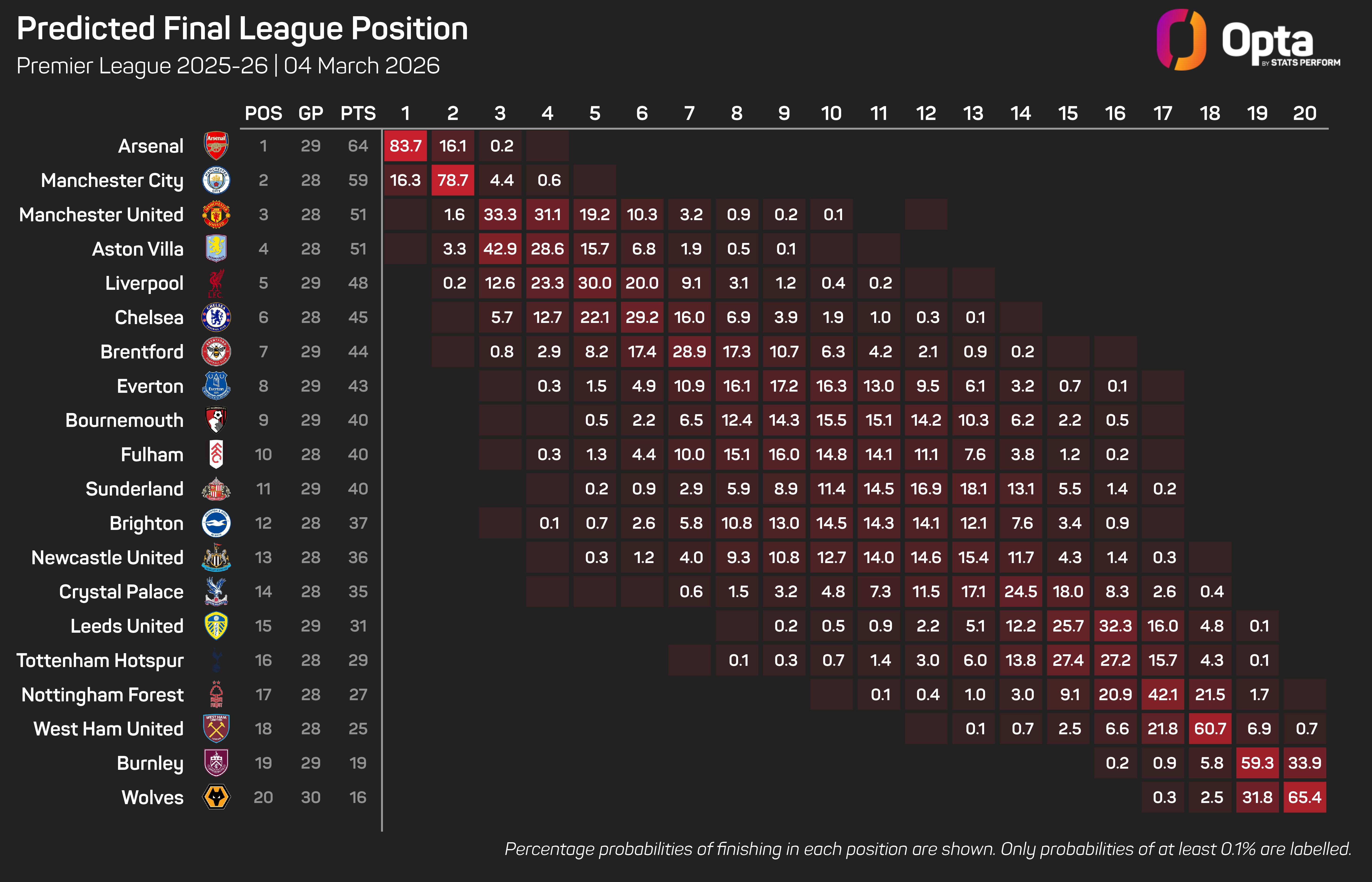 The Opta supercomputer has given United a 66% chance of finishing in the top four, and with fifth place likely to be enough to secure Champions League football next season, that figure improves to 85.2%.