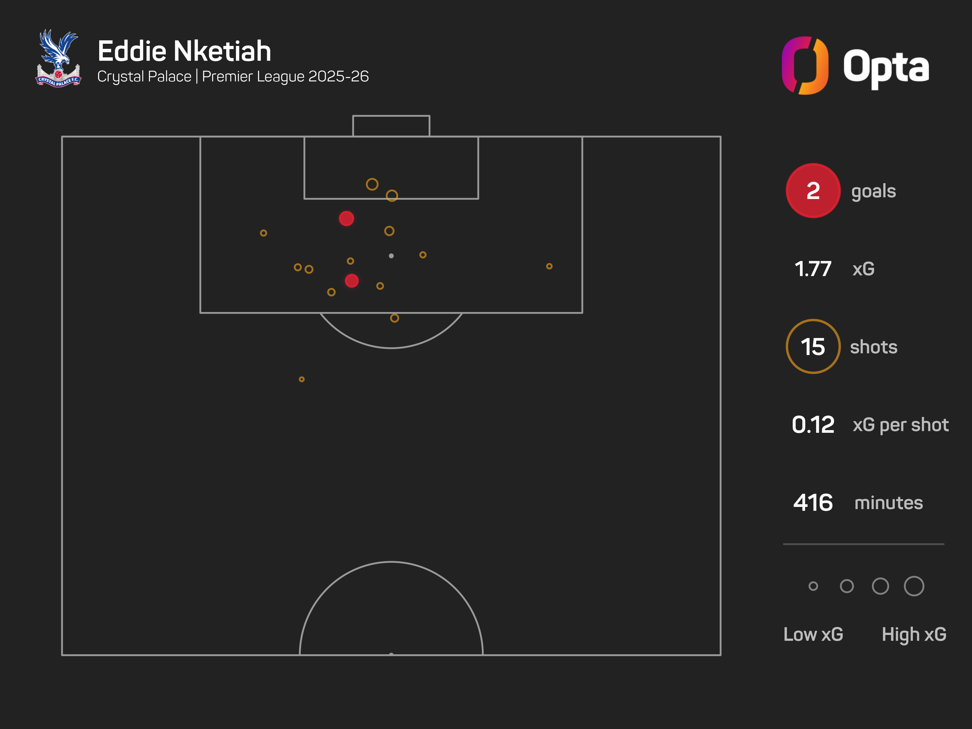Nketiah was the last Palace player other than Mateta to score a home Premier League goal, against Liverpool in September. Since then, 17 players other than Mateta have had a shot without scoring (83 shots, 18 on target, 8.5 xG).