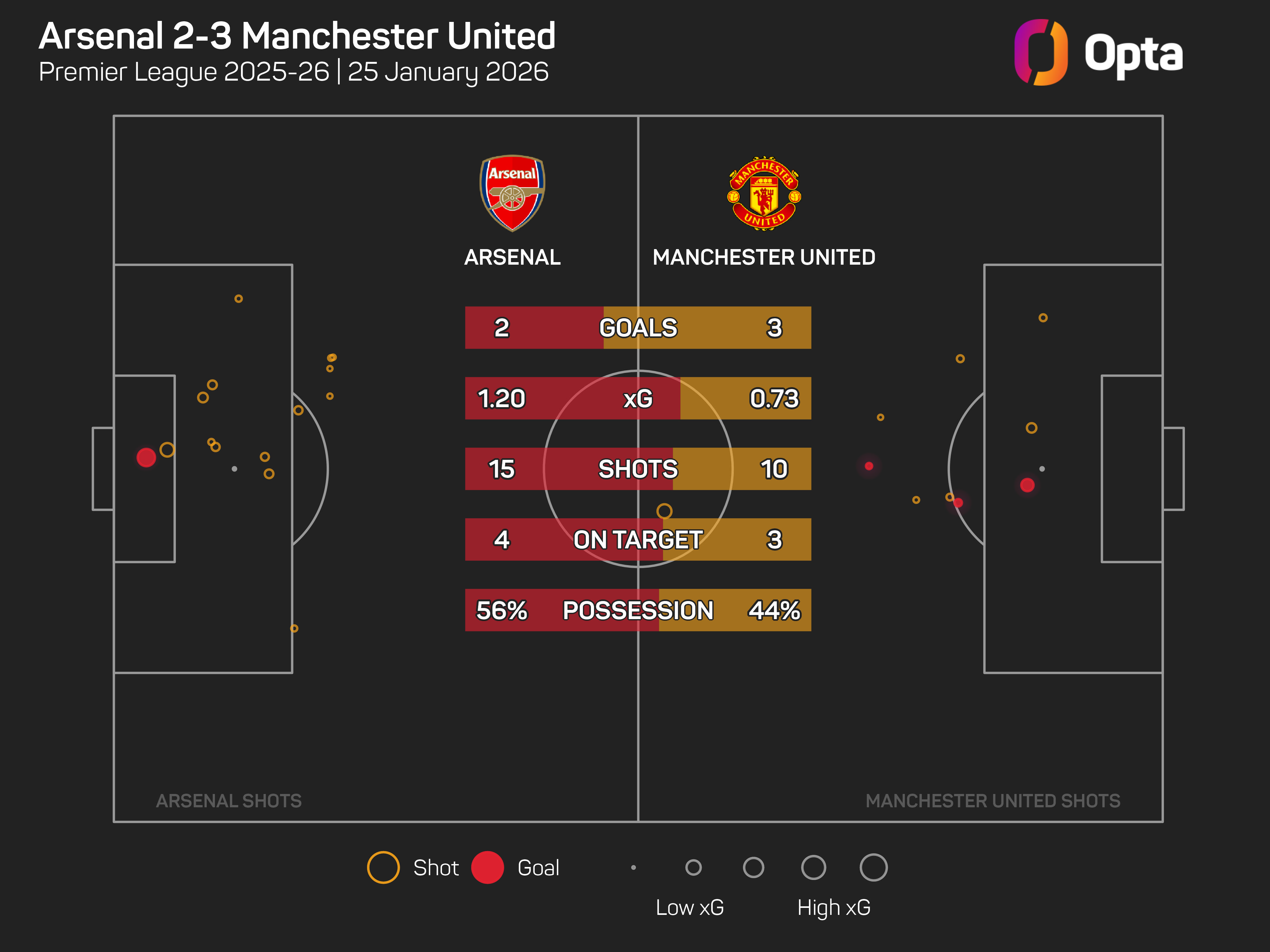 Through Dorgu and Cunha, United were the first visiting team to score at least two goals from outside the box away to Arsenal in the top-flight since Tottenham in October 2008.
