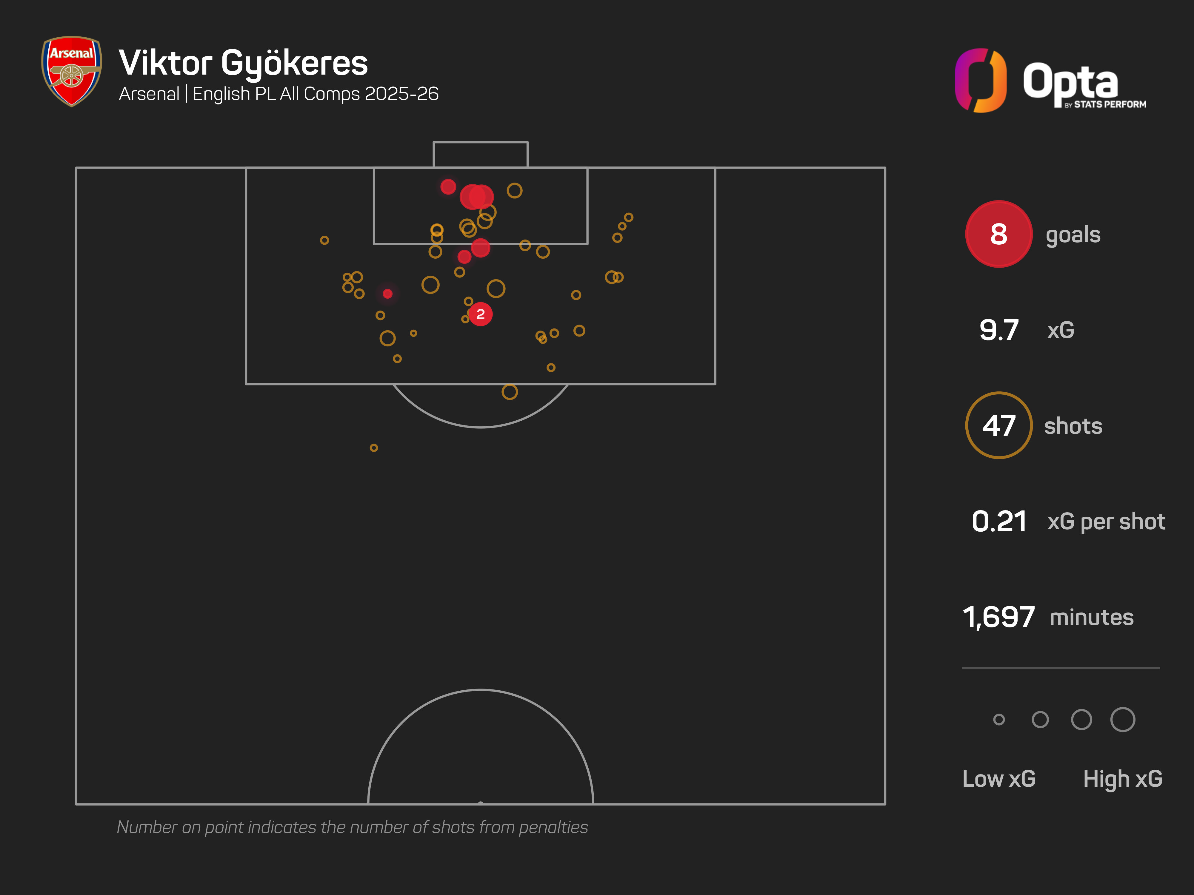 Gyokeres' strikes have come from an expected goals (xG) total of 9.73, a slight underperformance, while he has also missed 13 big chances, with only Ollie Watkins (15), Jean-Philippe Mateta (22) and Erling Haaland (29) missing more among Premier League players in 2025-26.