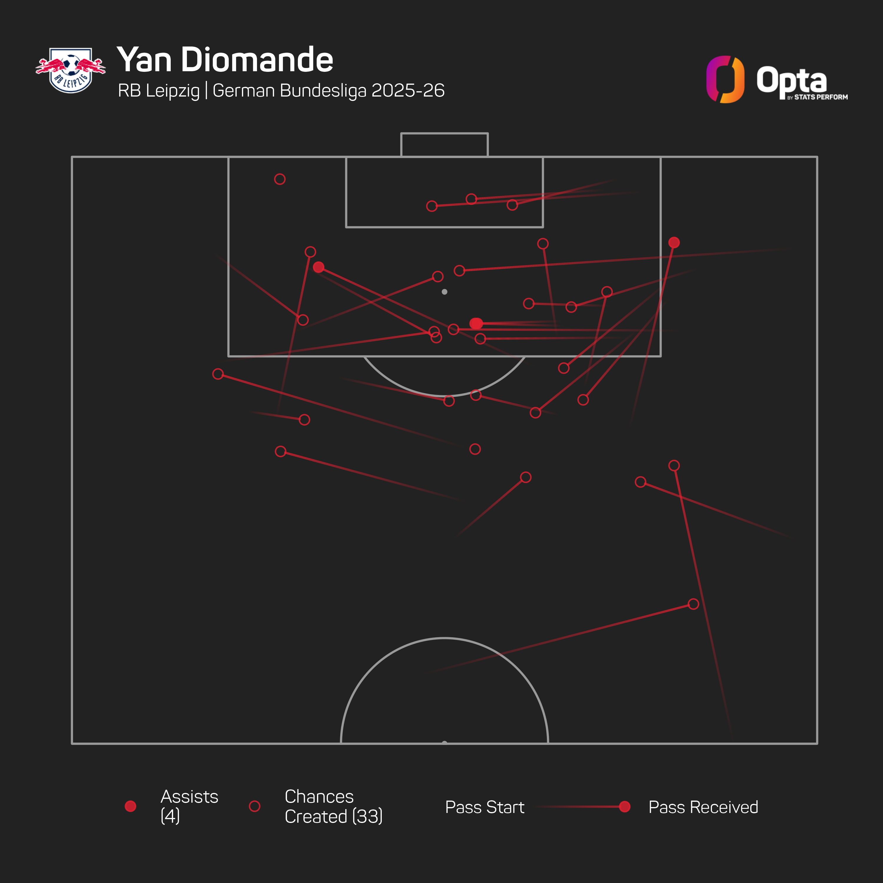 But Diomande has also produced an end product, with only three players bettering his 33 chances created from open play in this season's Bundesliga (Romano Schmid – 49, Olise – 48, Luis Diaz – 45).