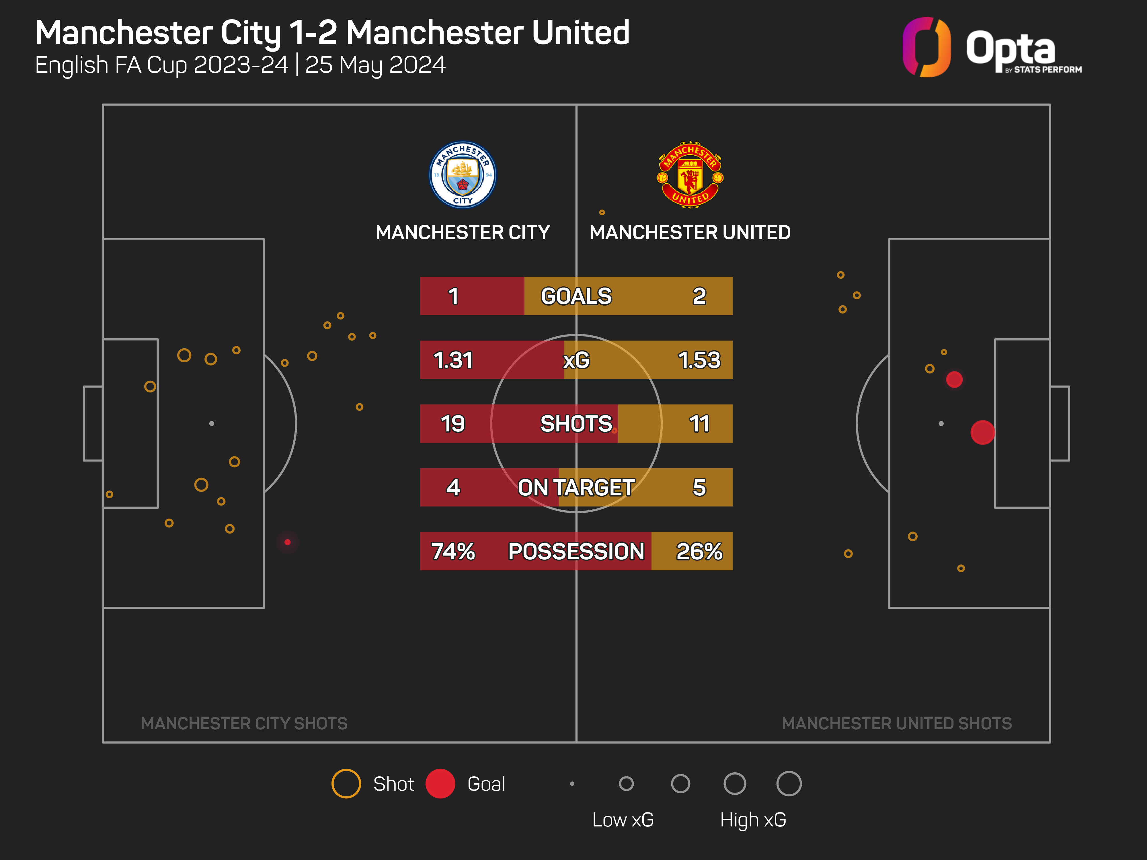 City dominated possession against United, having 73.5 per cent of the ball, but Erik ten Hag's team had more shots on target (five to four) and accumulated a higher expected goals figure (1.5 to 1.3).