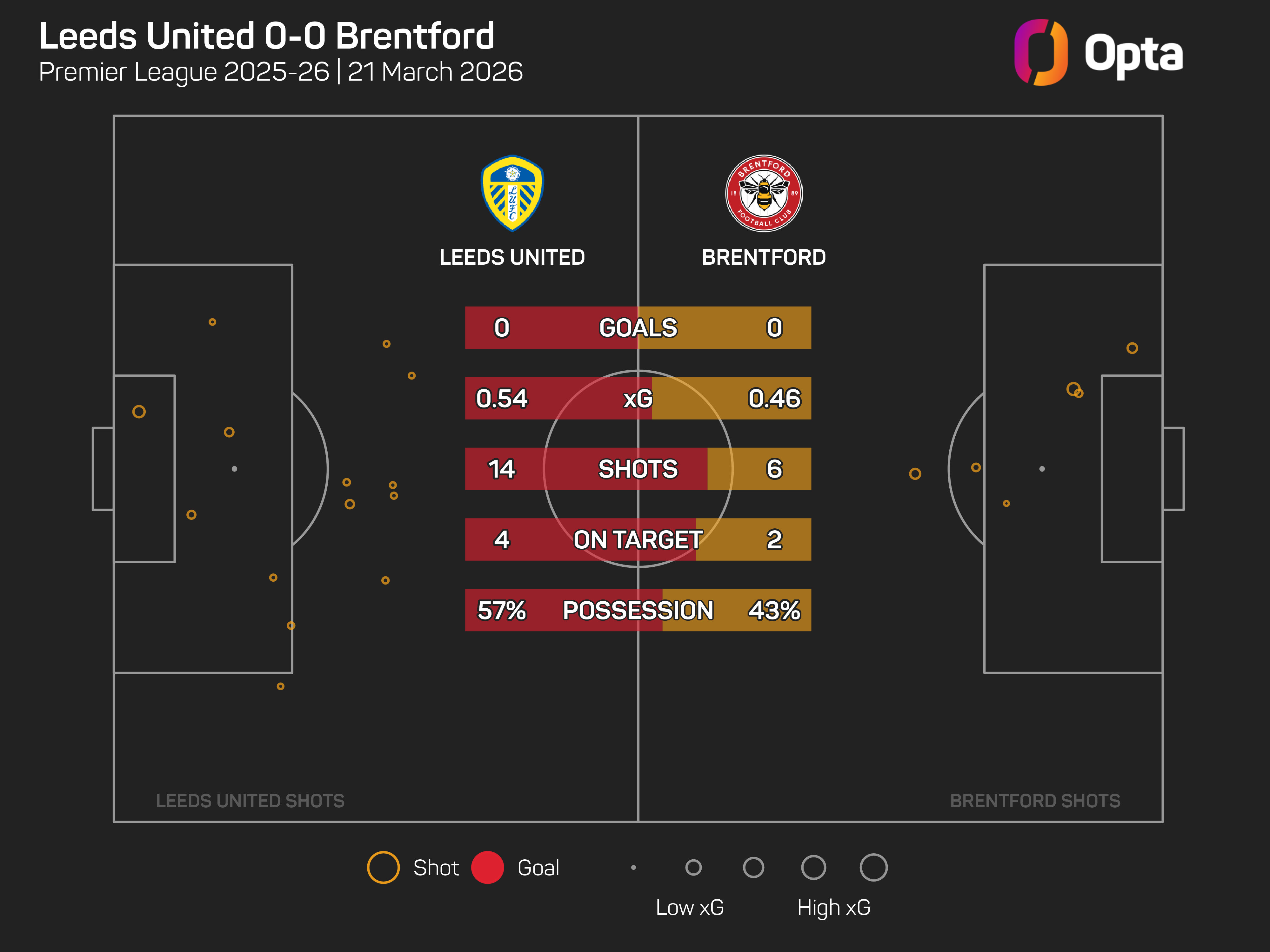 Neither team created a single Opta-defined 'big chance' in their draw at Elland Road, with the sides amassing 1.0 expected goals (xG) between them (0.54 for Leeds, 0.46 for Brentford).
