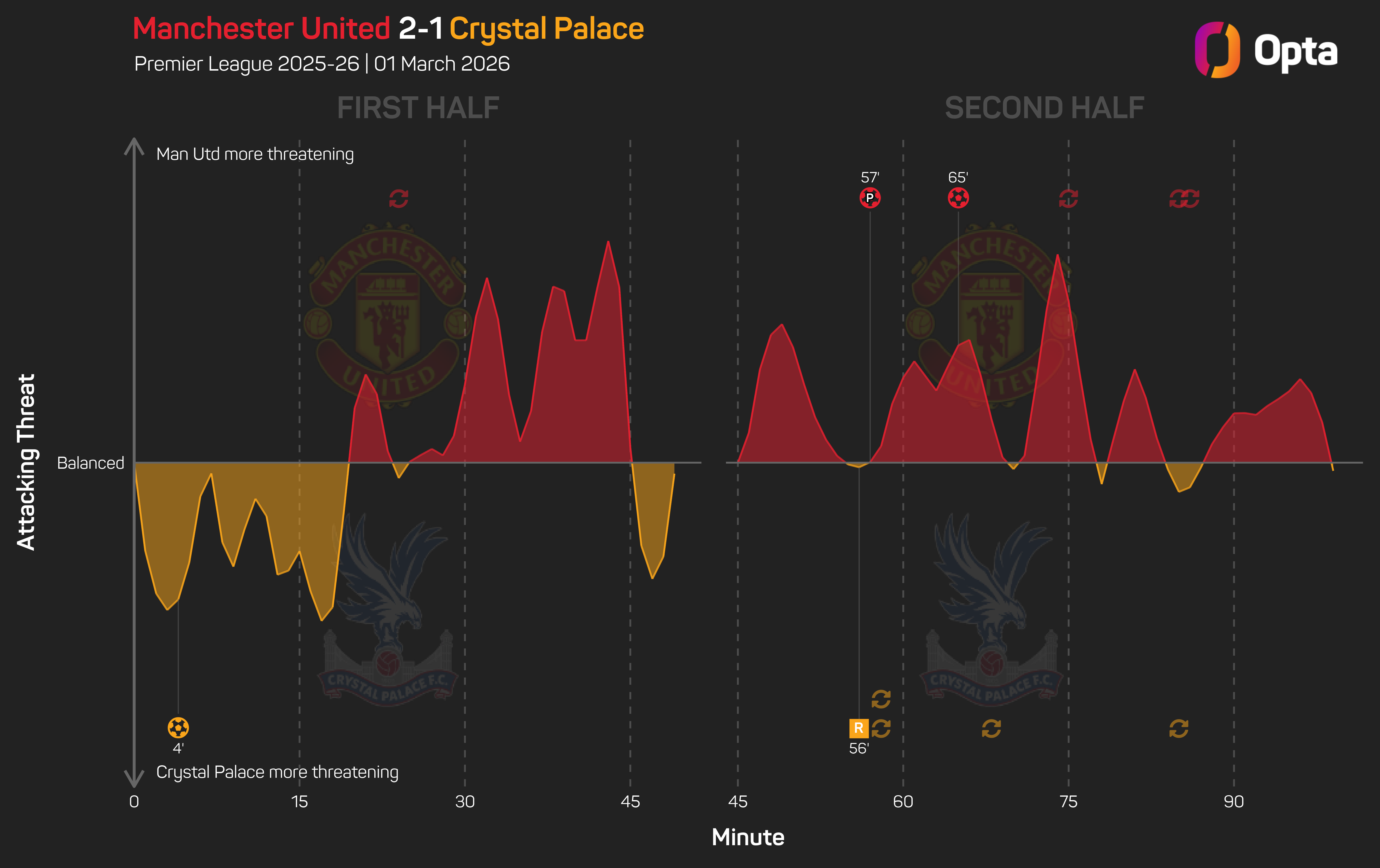 Maxence Lacroix's fourth-minute header had put Palace in front, but the defender was then sent off shortly after the hour for dragging back Matheus Cunha in the box.