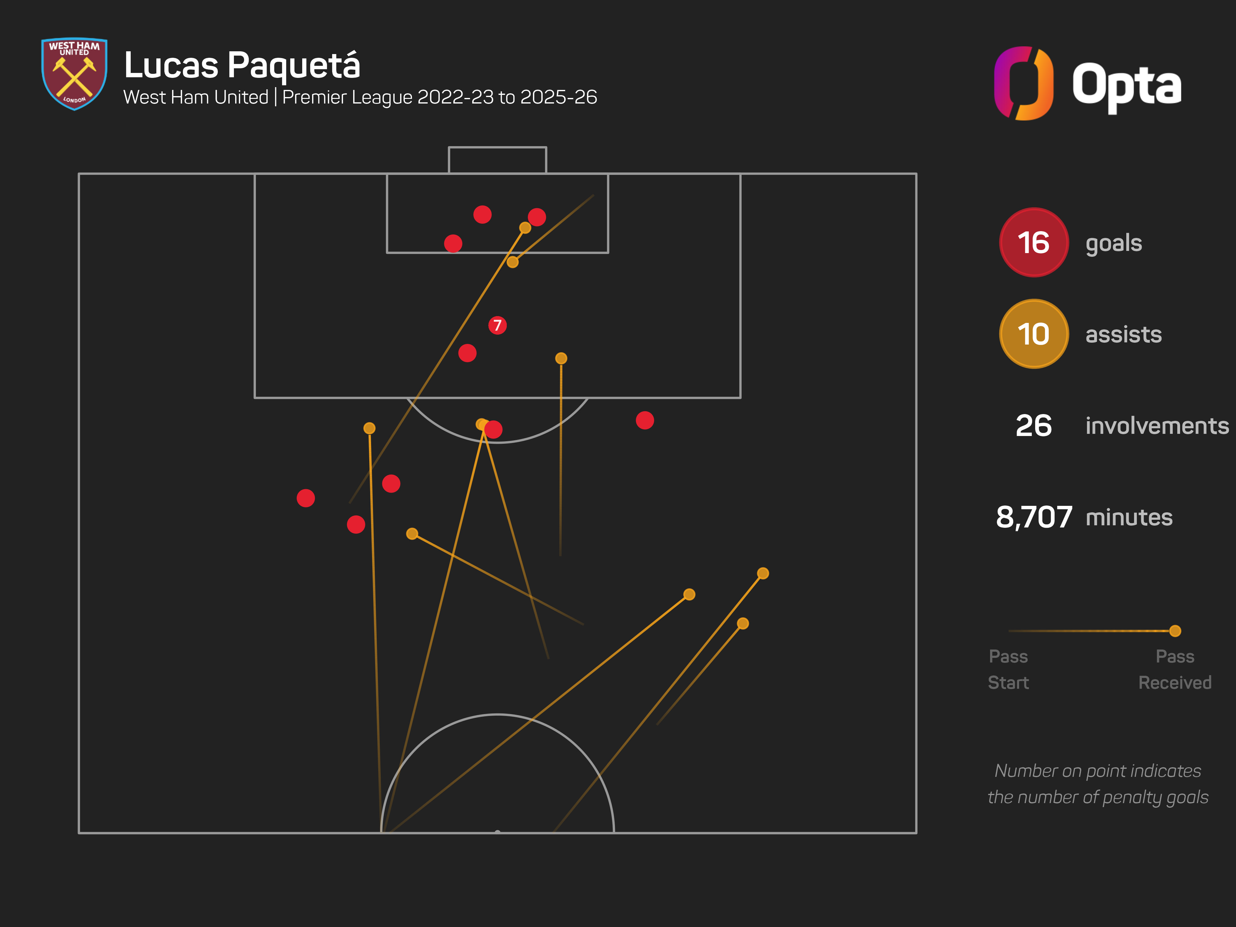Paqueta played 110 Premier League games for the Hammers, scoring 16 goals and supplying 10 assists.