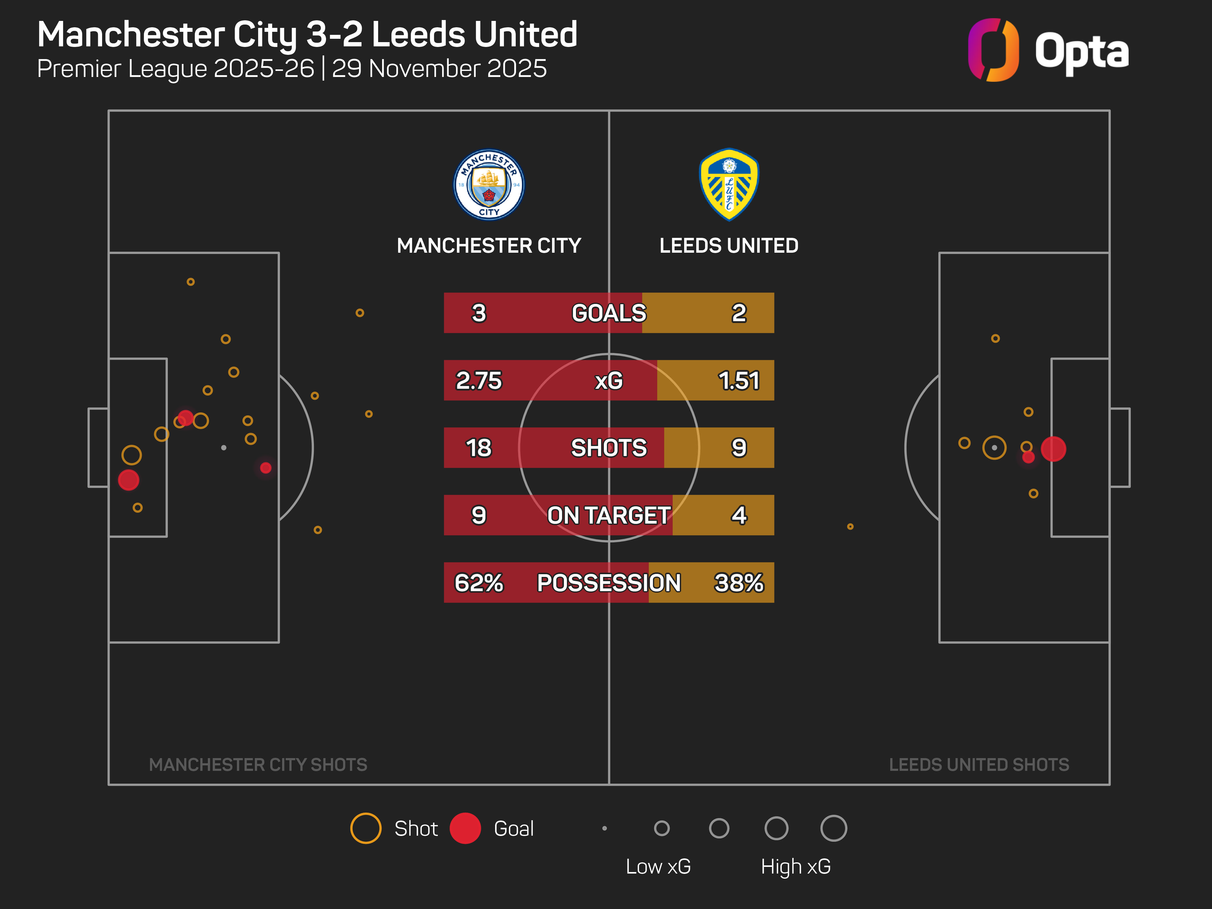 However, after failing to have an on-target shot in the first half, Leeds had more shots (seven to four) and created a higher expected goals (xG) tally (1.4 to 0.3) than City after the break.