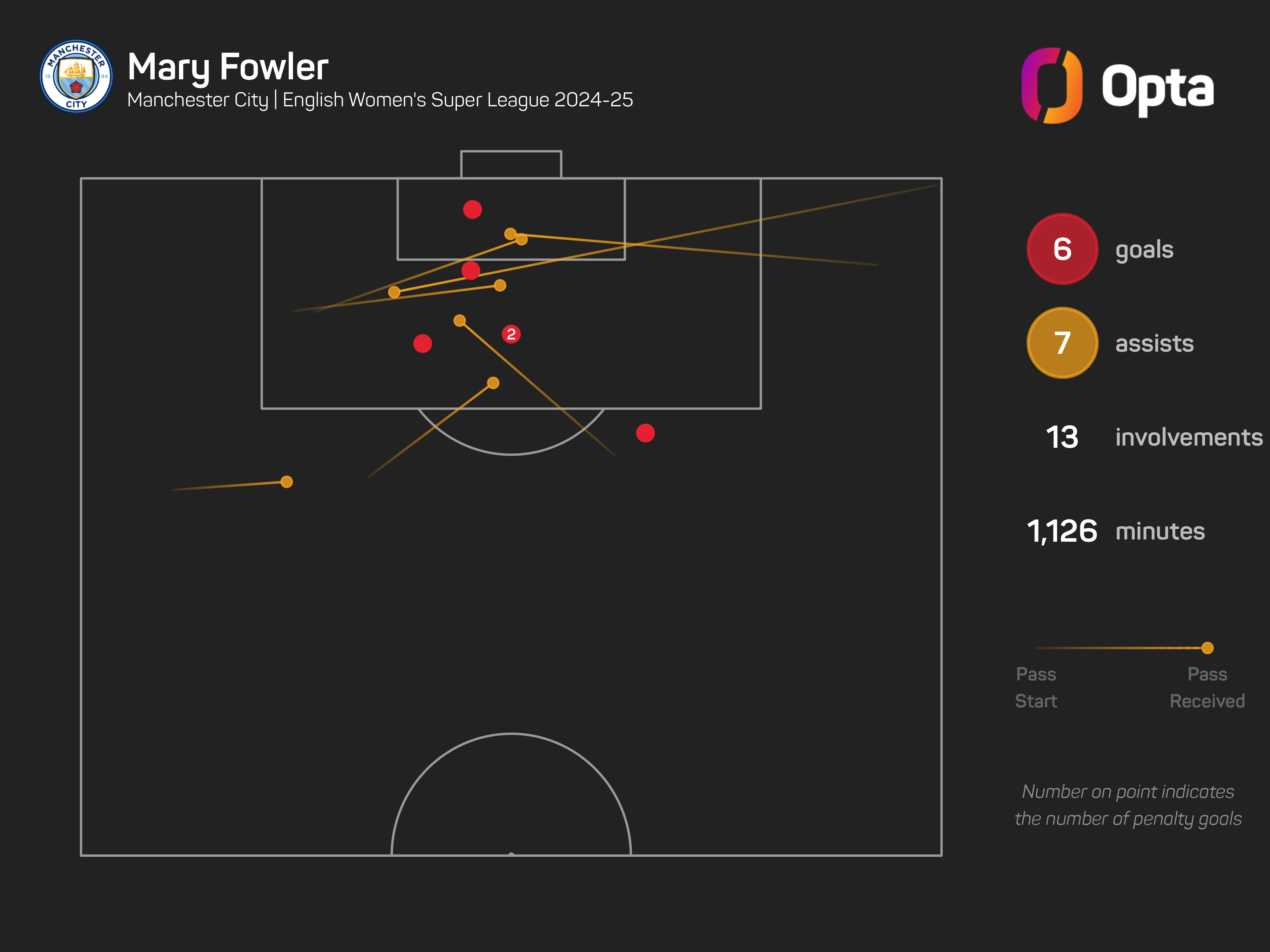 On average, she came up with a goal contribution every 86 minutes in the Women's Super League in 2024-25.