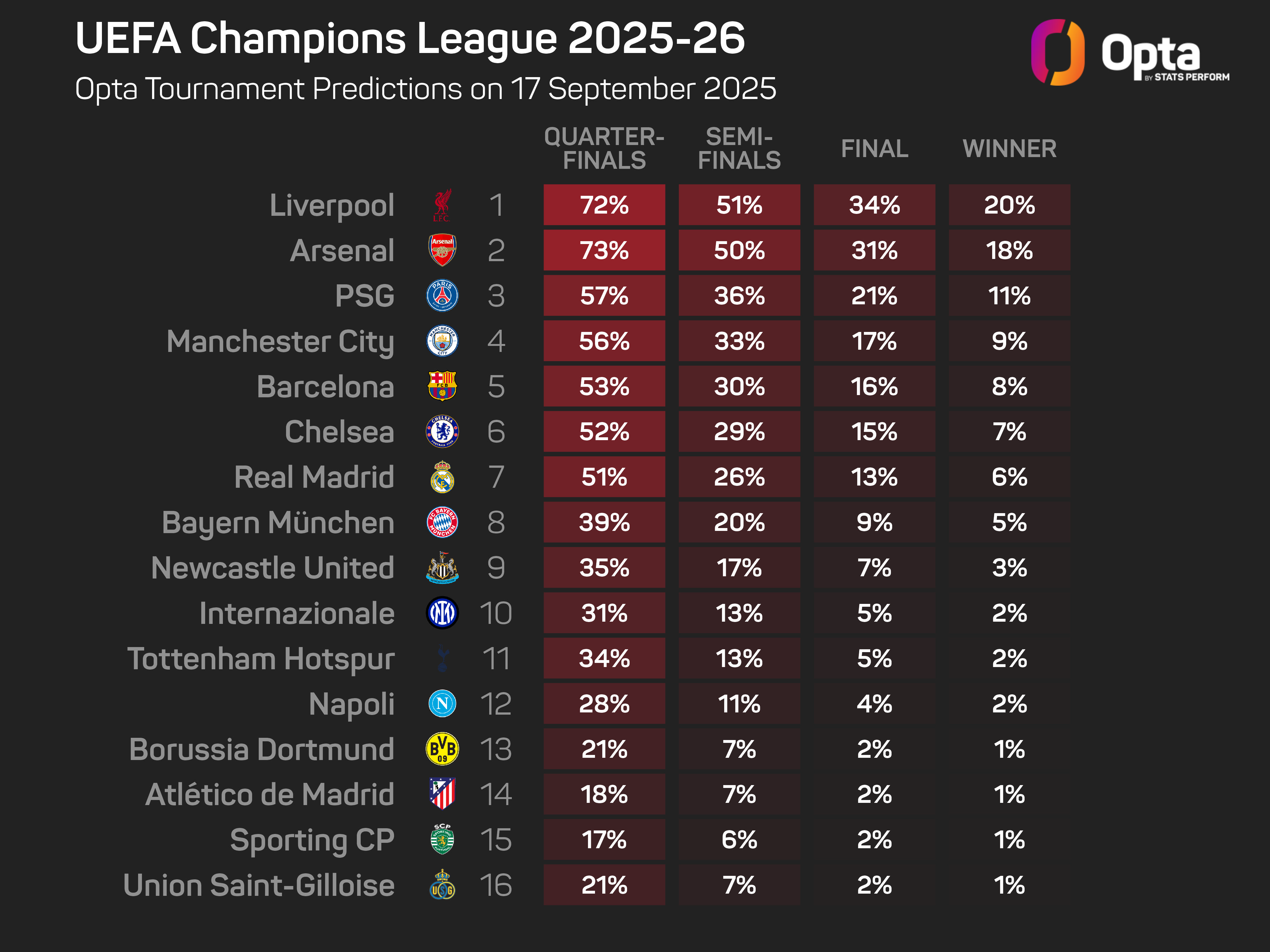 Despite winning the competition in 2023, City are not talked about as among the favourites this year, though the Opta supercomputer has handed them a 9% probability of winning the title. Only Paris Saint-Germain (11%), Arsenal (18%) and Liverpool (20%) are ranked higher.