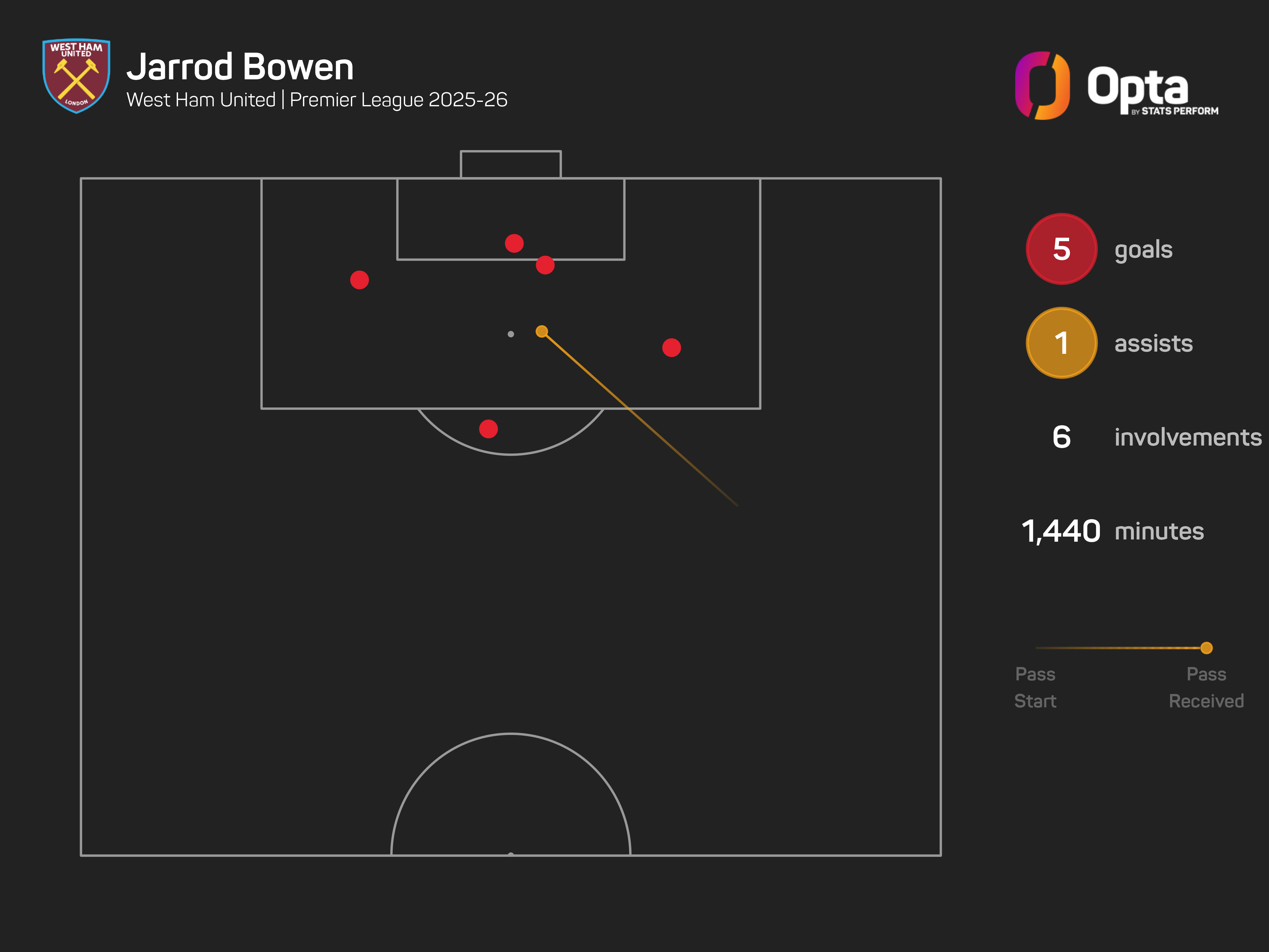 In a disappointing season for West Ham, Jarrod Bowen has led by example, registering team-high totals for goals (five) and completed dribbles (25), while only Mateus Fernandes (17) and Lucas Paqueta (18) have created more chances than the England international (12).