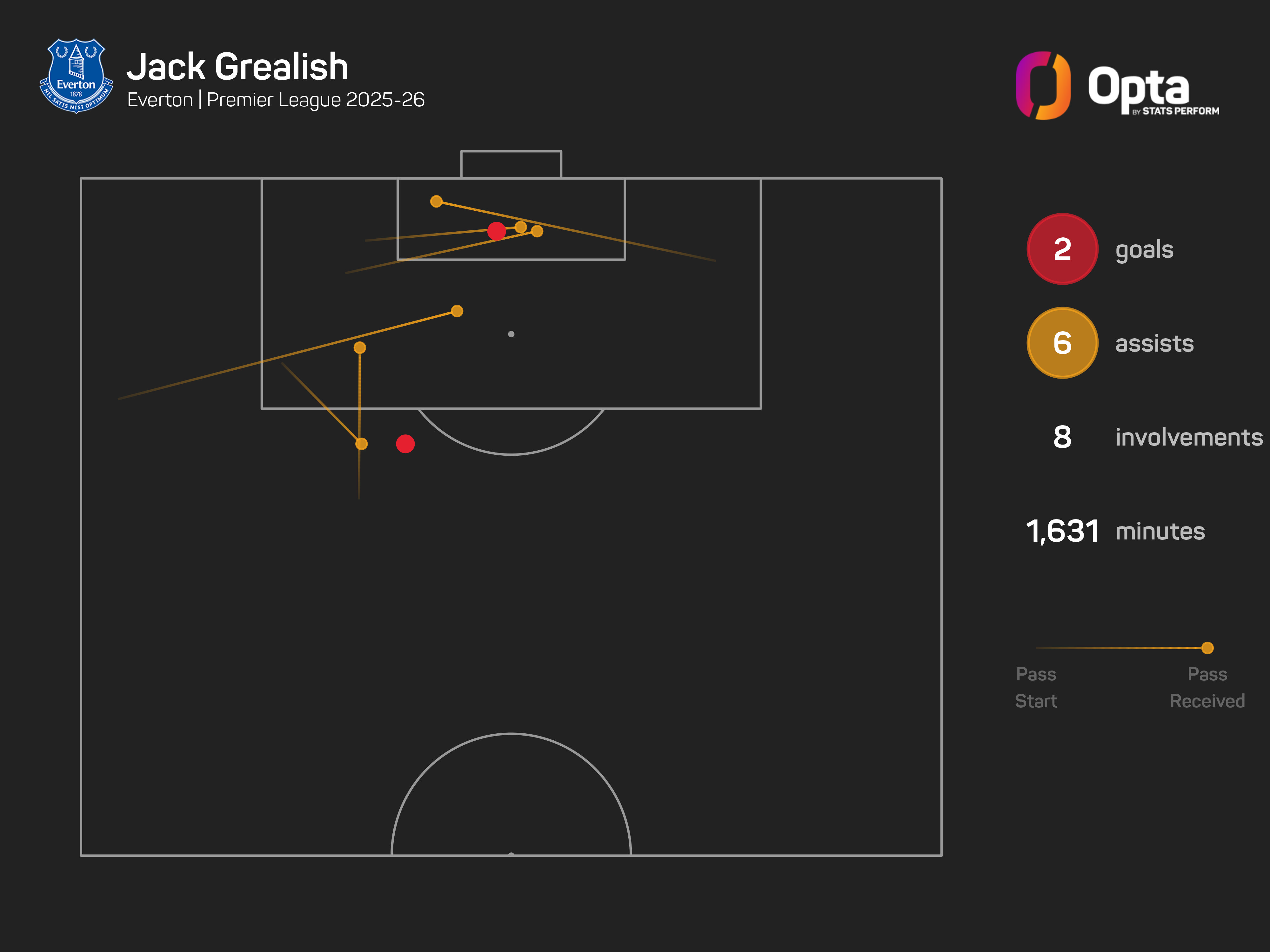 Grealish made a flying start at Everton, providing two assists in each of his first two starts for the Toffees.