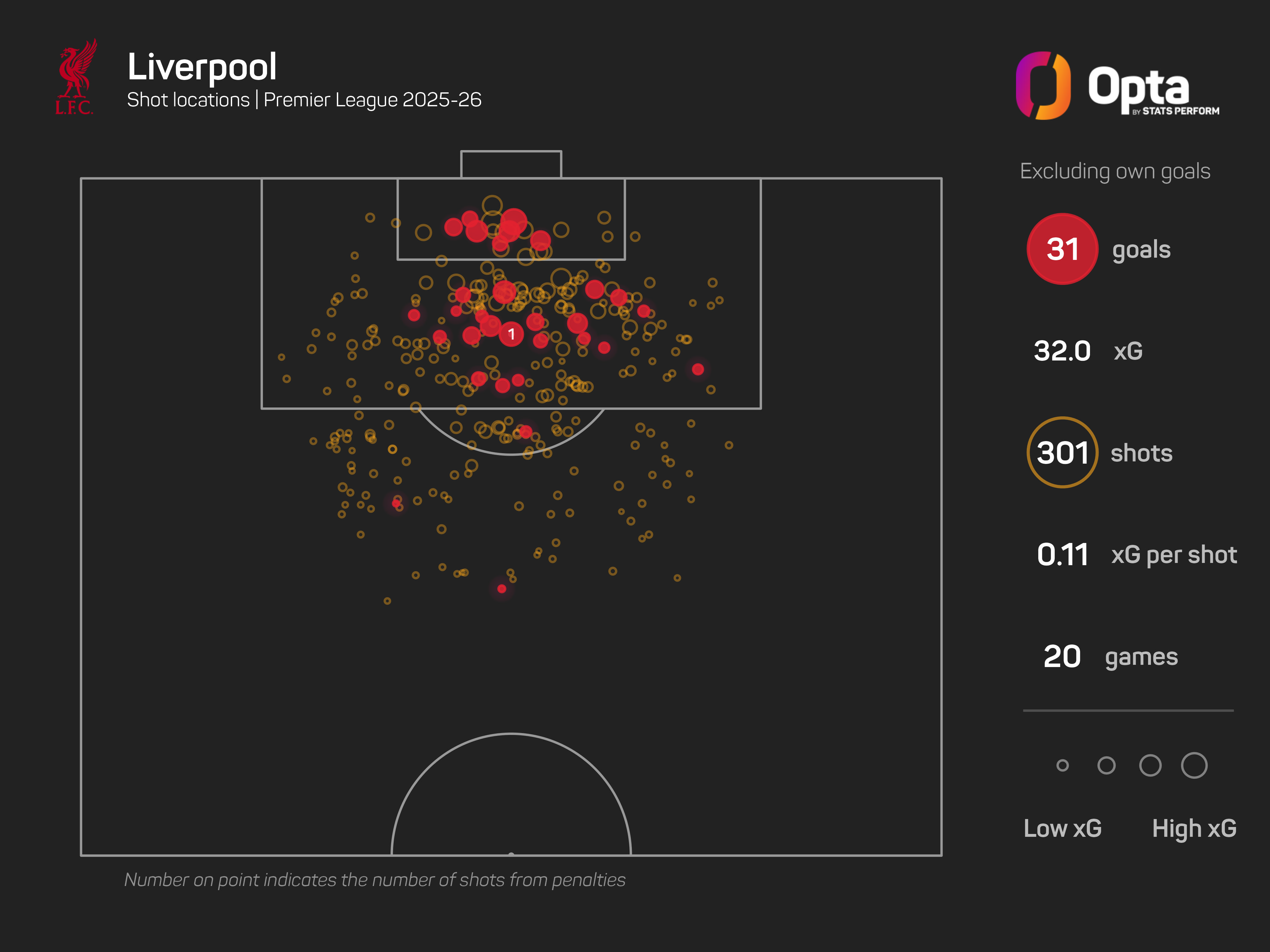 Slot's team have also scored just 32 goals, the joint-fifth highest in the division alongside Brentford, while also performing to their season expected goals (xG) total (31.9).