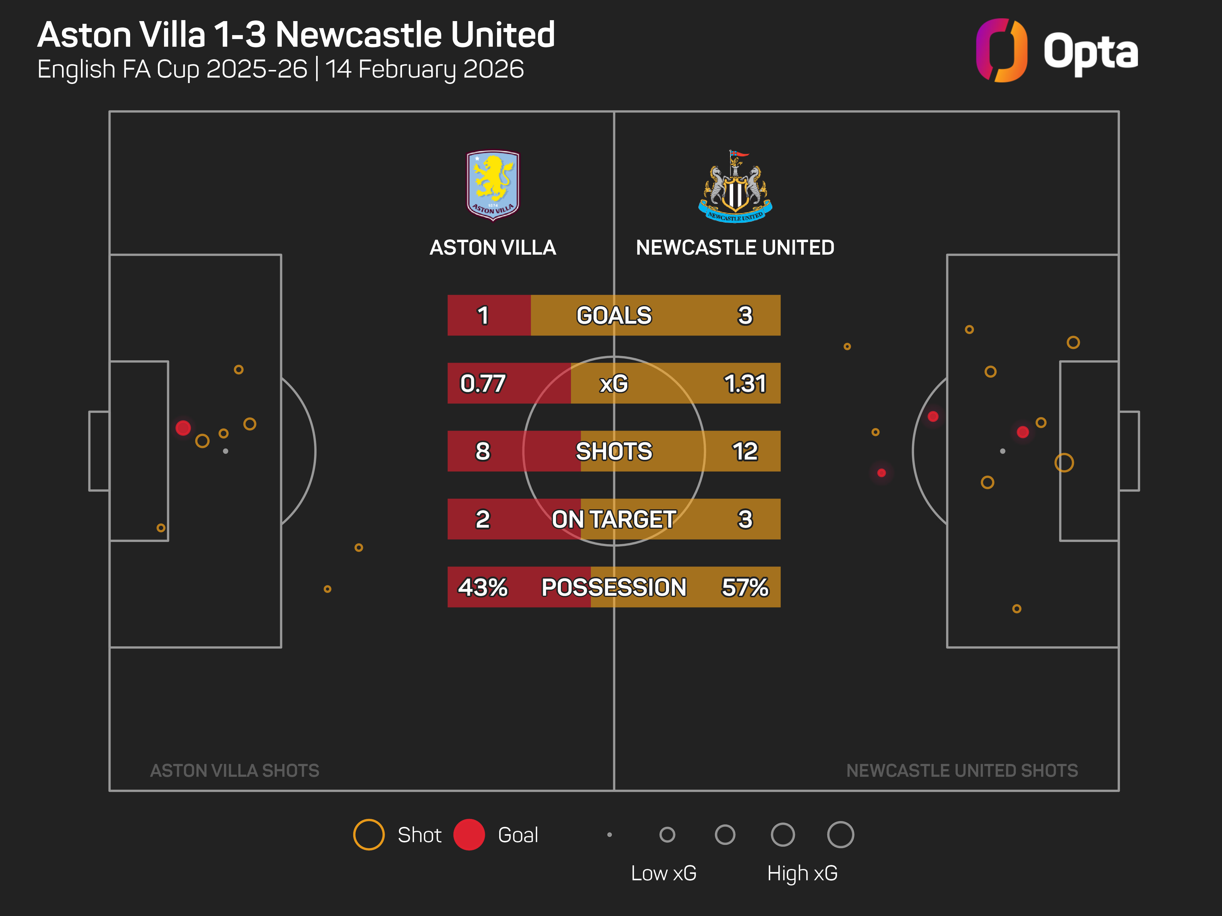 Tammy Abraham's first goal since returning to Villa opened the scoring, but a straight red card for goalkeeper Marco Bizot immediately before the interval shifted the momentum in Newcastle's favour.