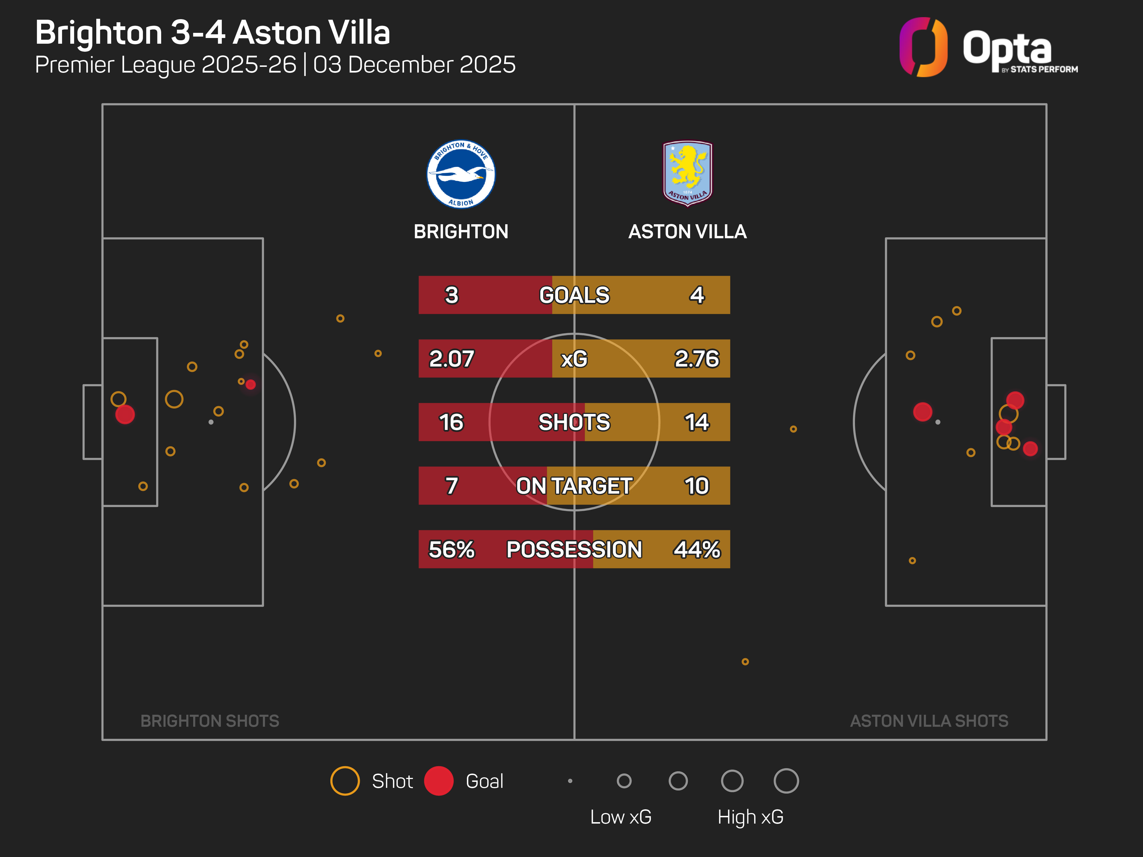 Amadou Onana and substitute Donyell Malen put Villa in control, and though Van Hecke's second seven minutes of time threatened a rip-roaring finish, Brighton were unable to find a leveller in front of their home supporters.