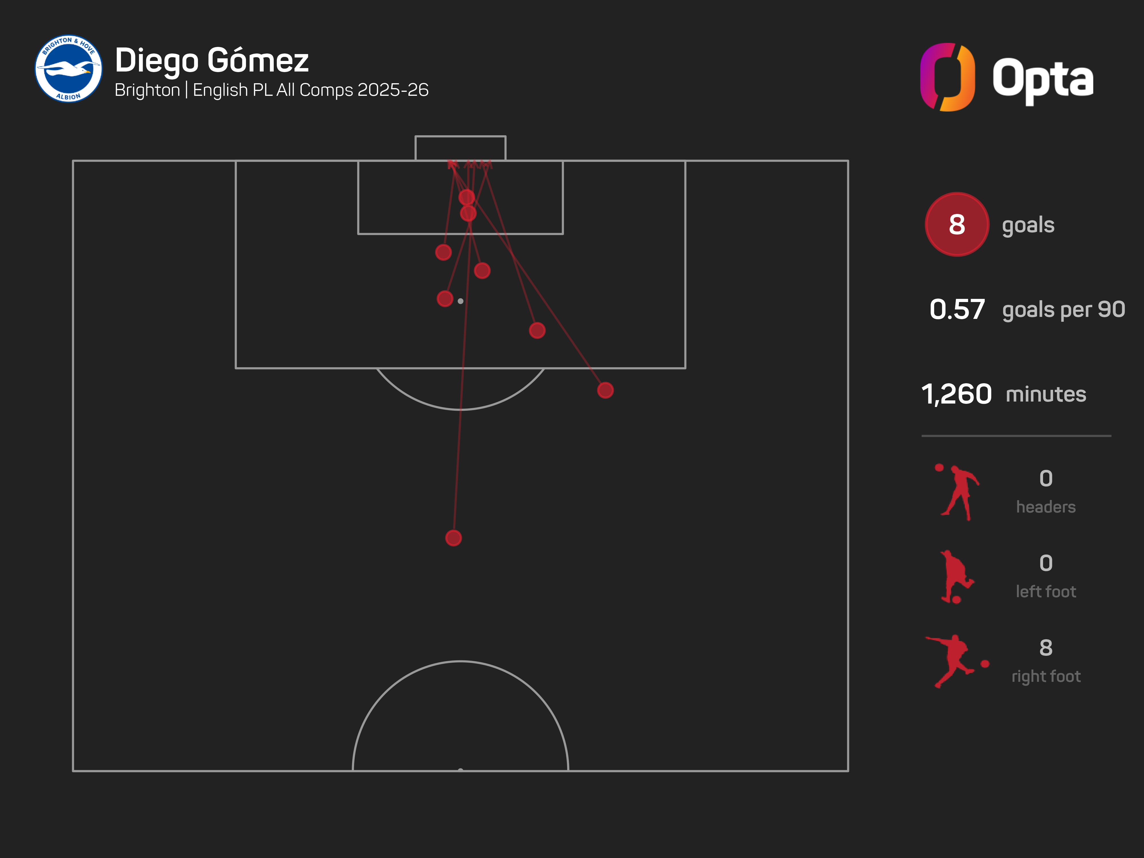 Gomez is Brighton's leading scorer in all competitions this season with eight goals, with six of those coming away from home.