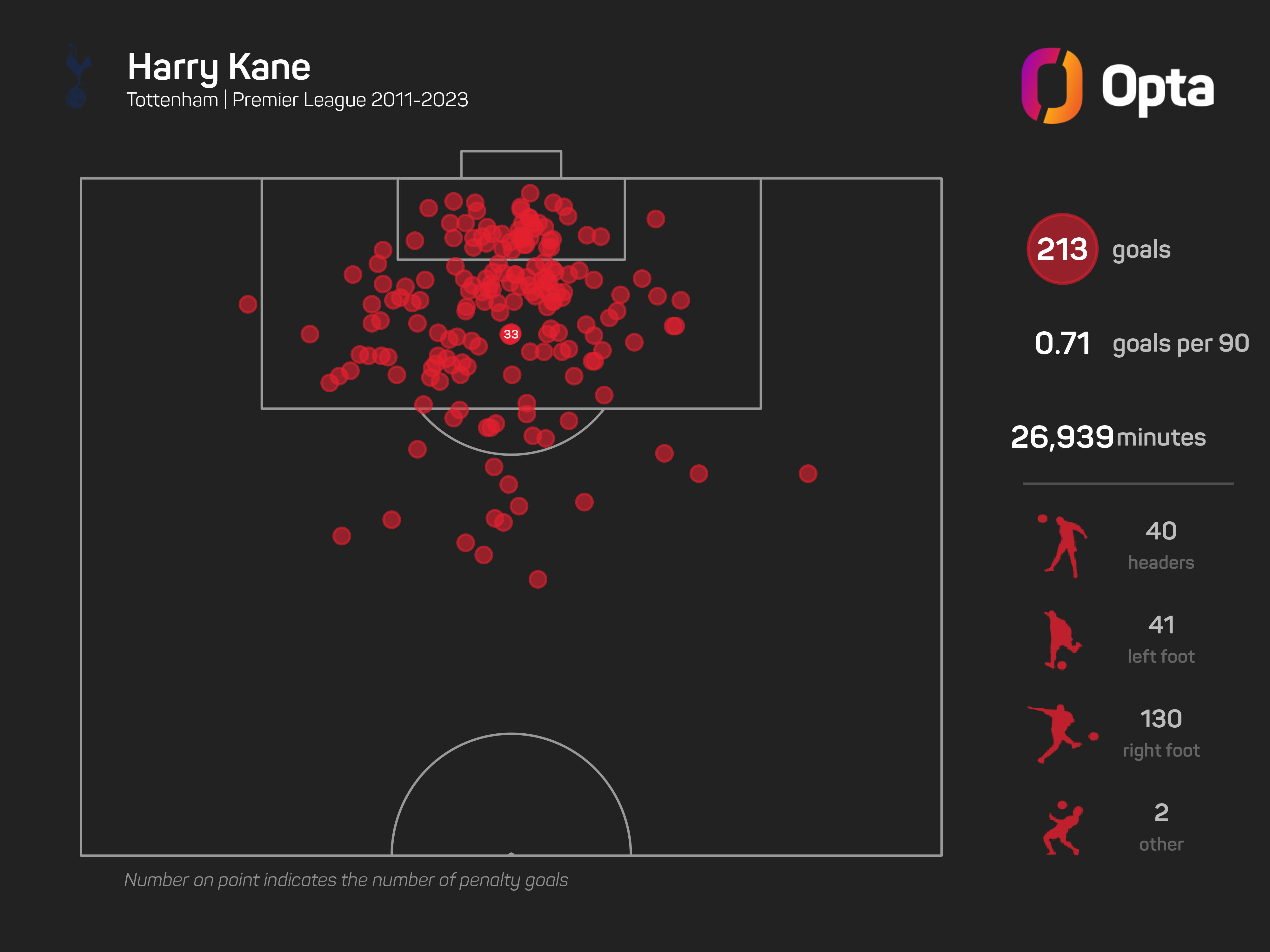 He netted 213 times for Spurs in the Premier League, across 317 matches, averaging 0.67 goals per game.