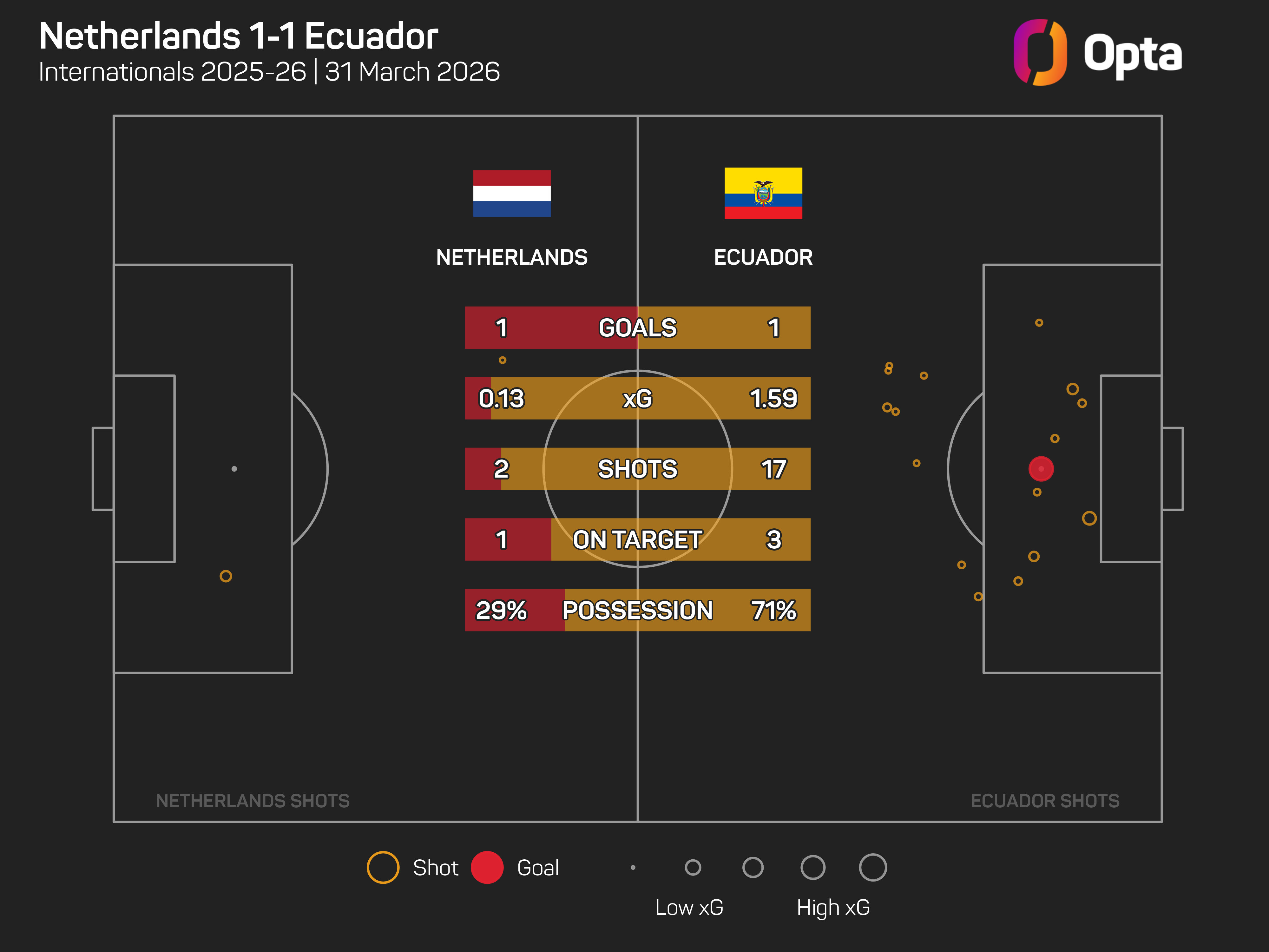 While the Netherlands' attacking play suffered due to the early red card (two shots in total), they defended resolutely as Ecuador peppered 17 efforts towards goals, though only three were on target.
