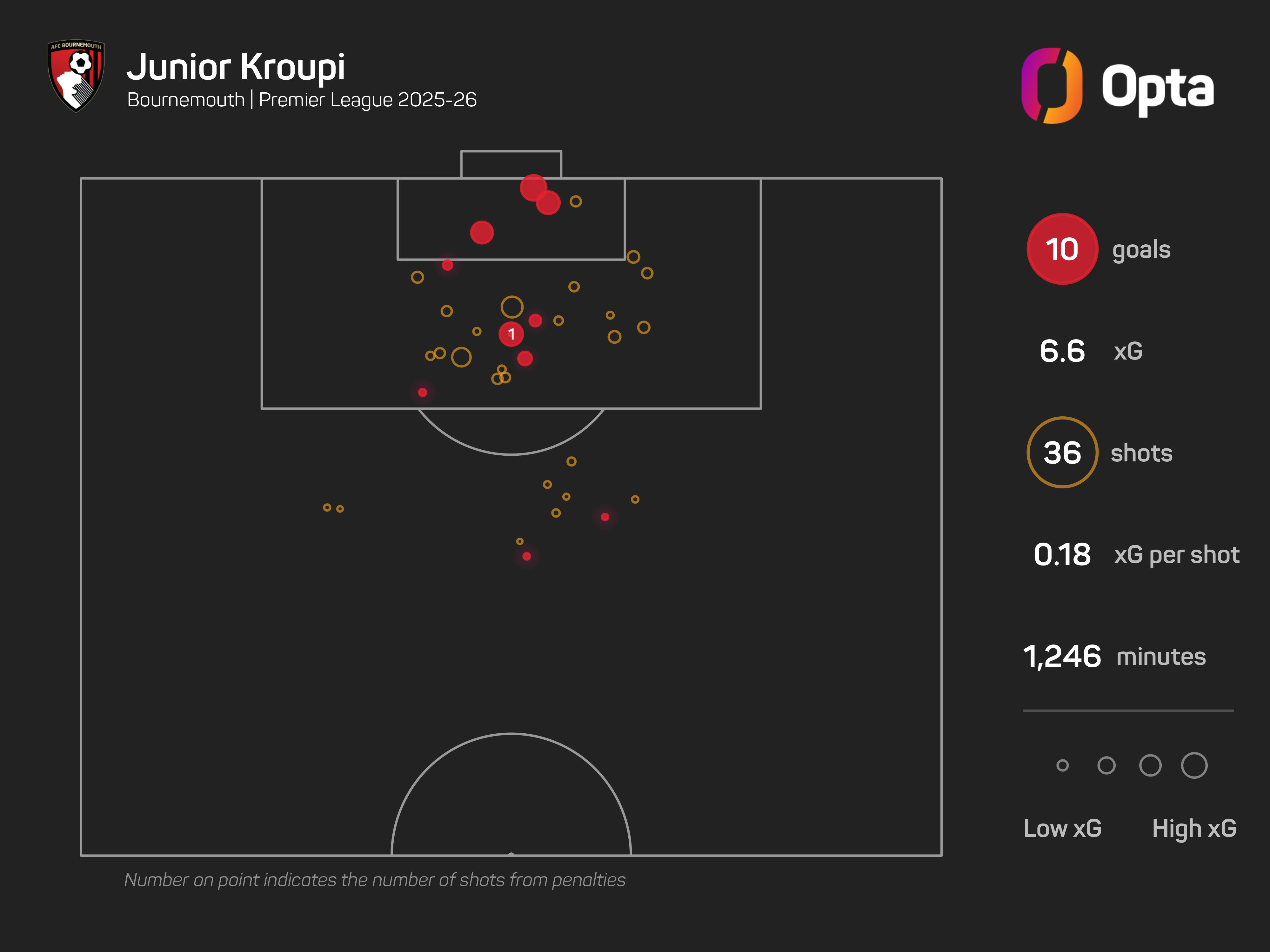 Kroupi has scored in back-to-back games for the third time this season, having also netted in a 2-2 draw with Manchester United prior to the international break. He previously had a three-match scoring run in September and October and netted in Bournemouth's first two games of 2026.