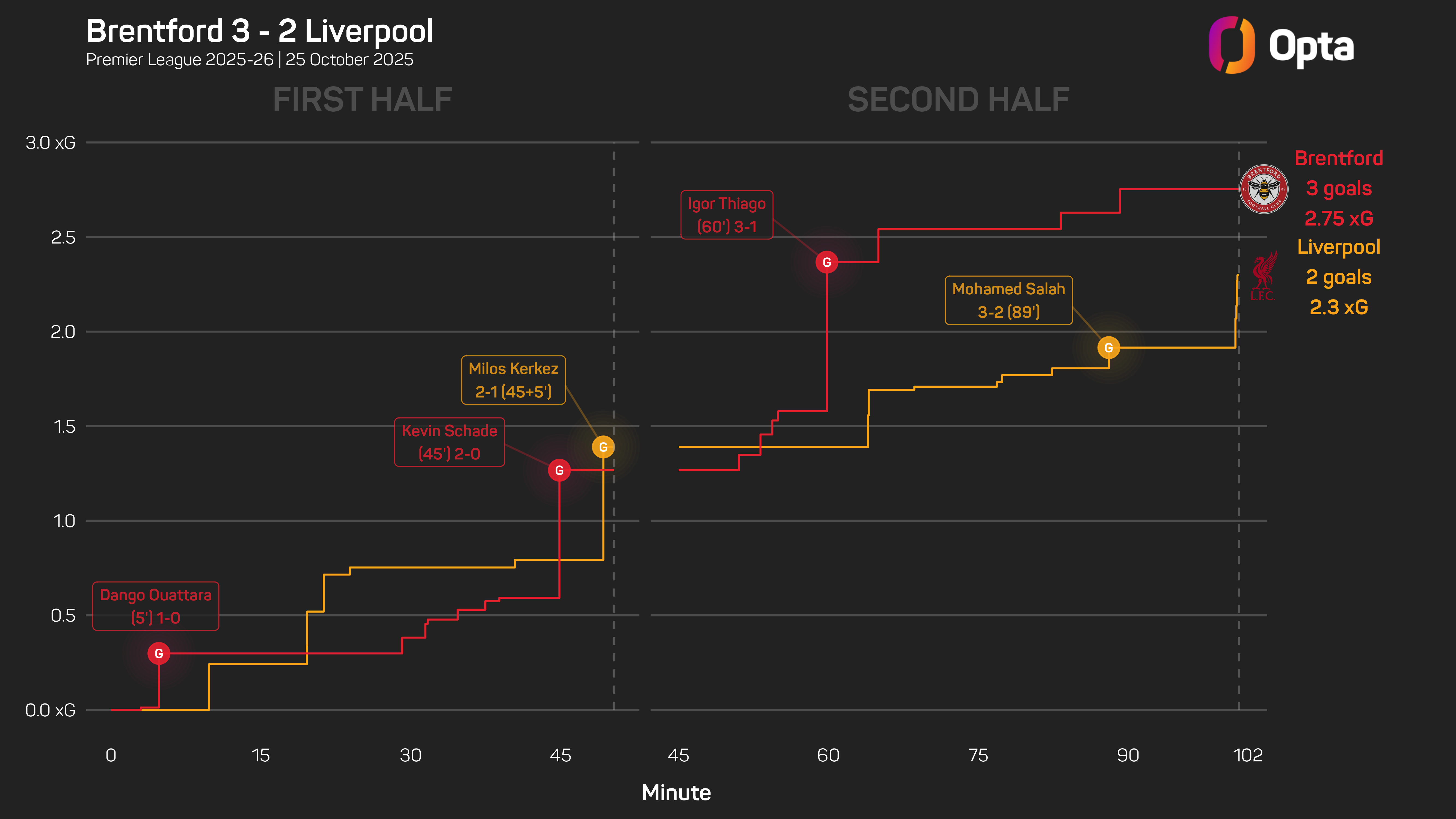 Liverpool went down 3-2 at the Gtech Community Stadium, as their losing streak in the Premier League stretched to four games. The Opta supercomputer now ranks the Reds' chances of retaining the title at just 11.1%.