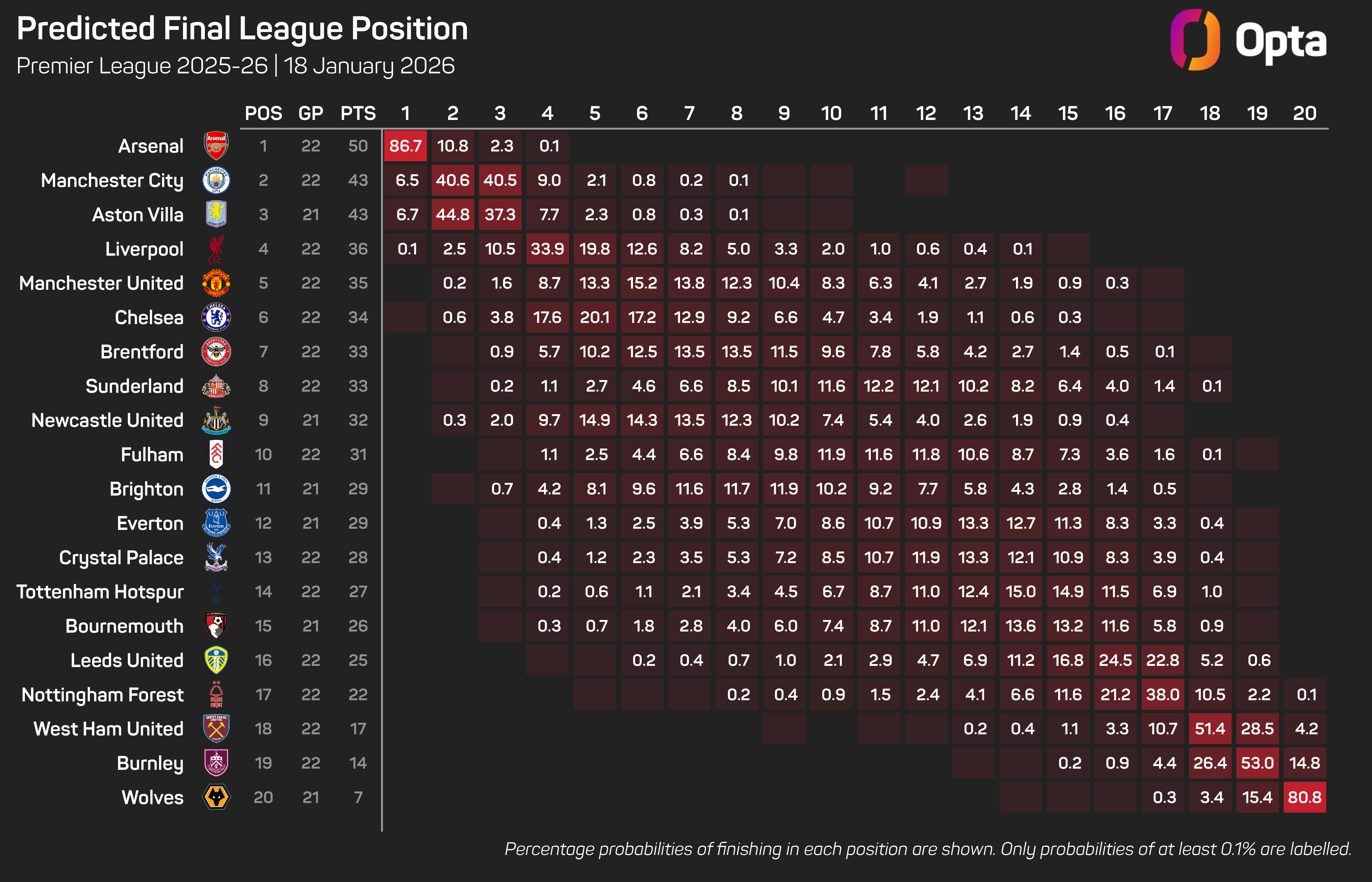 Arsenal are still given an 86.7% chance of clinching their first Premier League title since 2004, according to the Opta supercomputer, while their hopes of winning the Champions League, where they sit top of the league standings, are also the highest of any team at 26%.