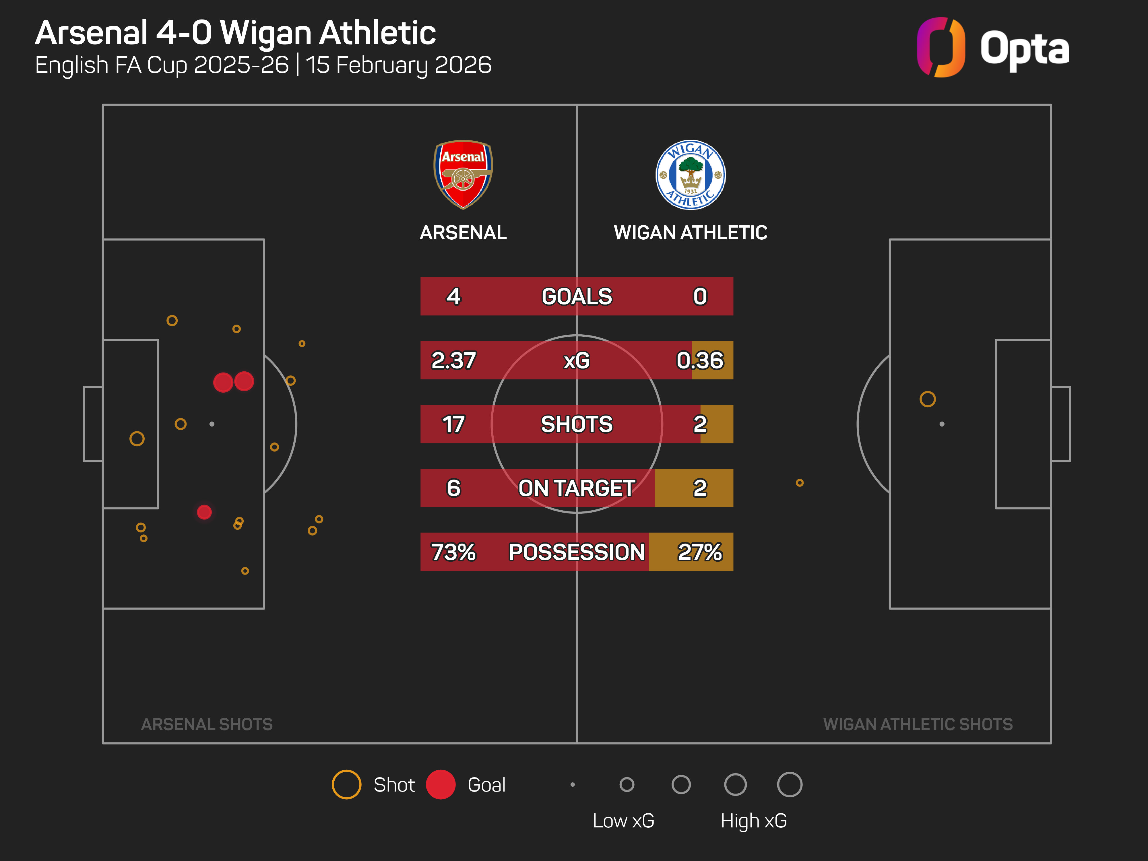 Having side-footed home after being released by Eberechi Eze's pass, Madueke saw Gabriel Martinelli and Gabriel Jesus join him on the scoresheet, while Wigan's Jack Hunt put through his own net.