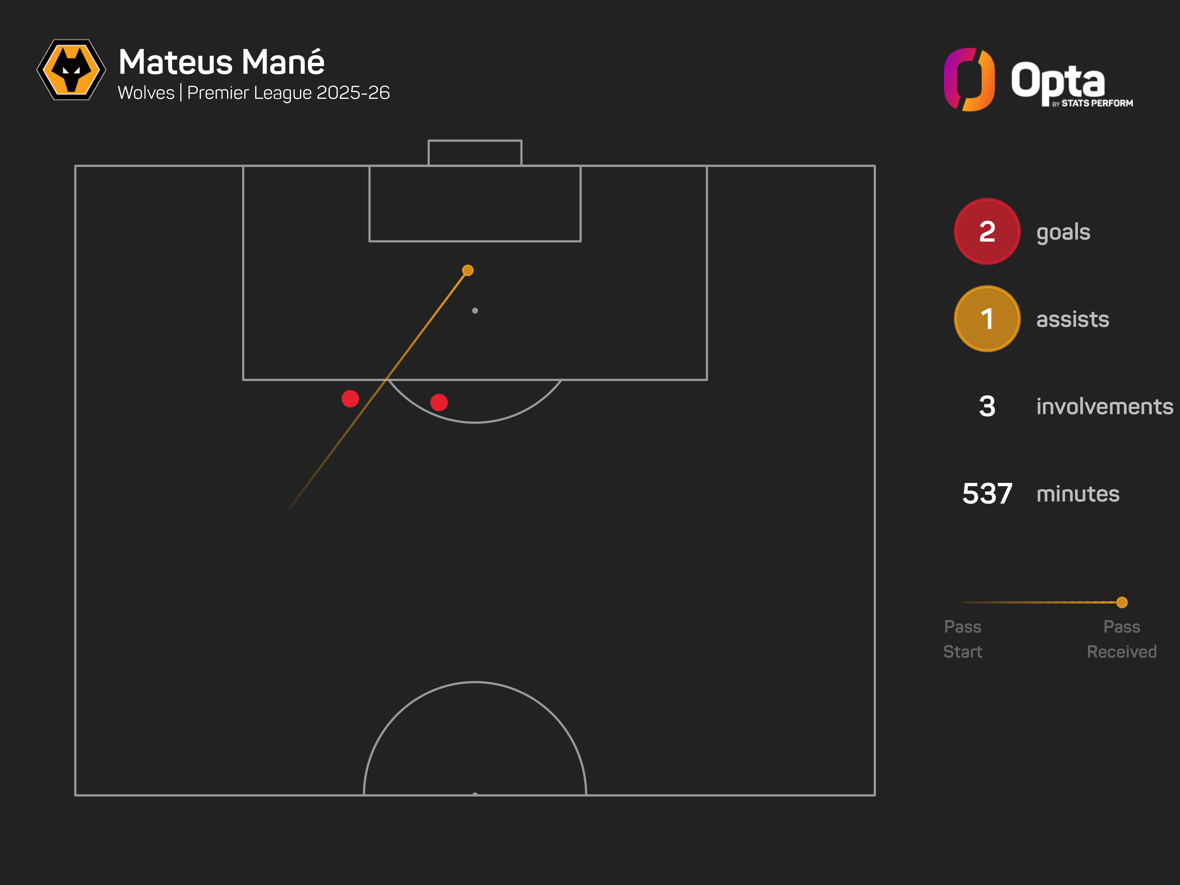 Since the start of December, 18-year-old Mane has the most goals (two) and goal involvements (three) for Wolves in the Premier League.