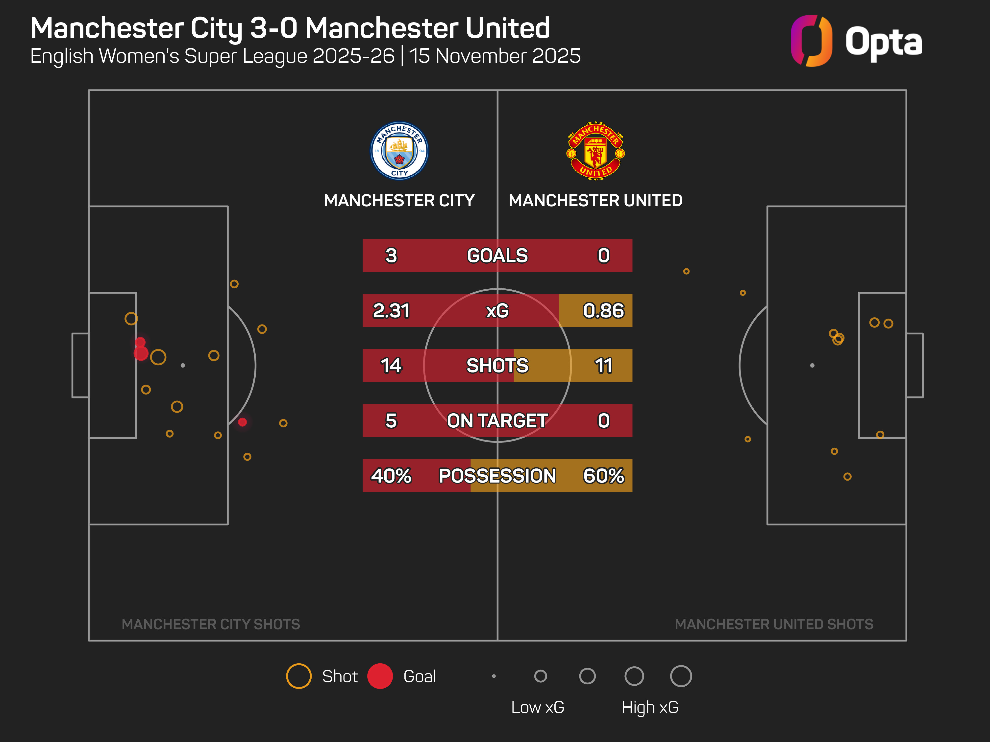 The hosts were certainly deserved victors as they racked up 14 shots on United's nine, hitting the target five times while the Red Devils failed to do so once. City also won the expected goals (xG) battle comfortably, by 2.31 to 0.86.