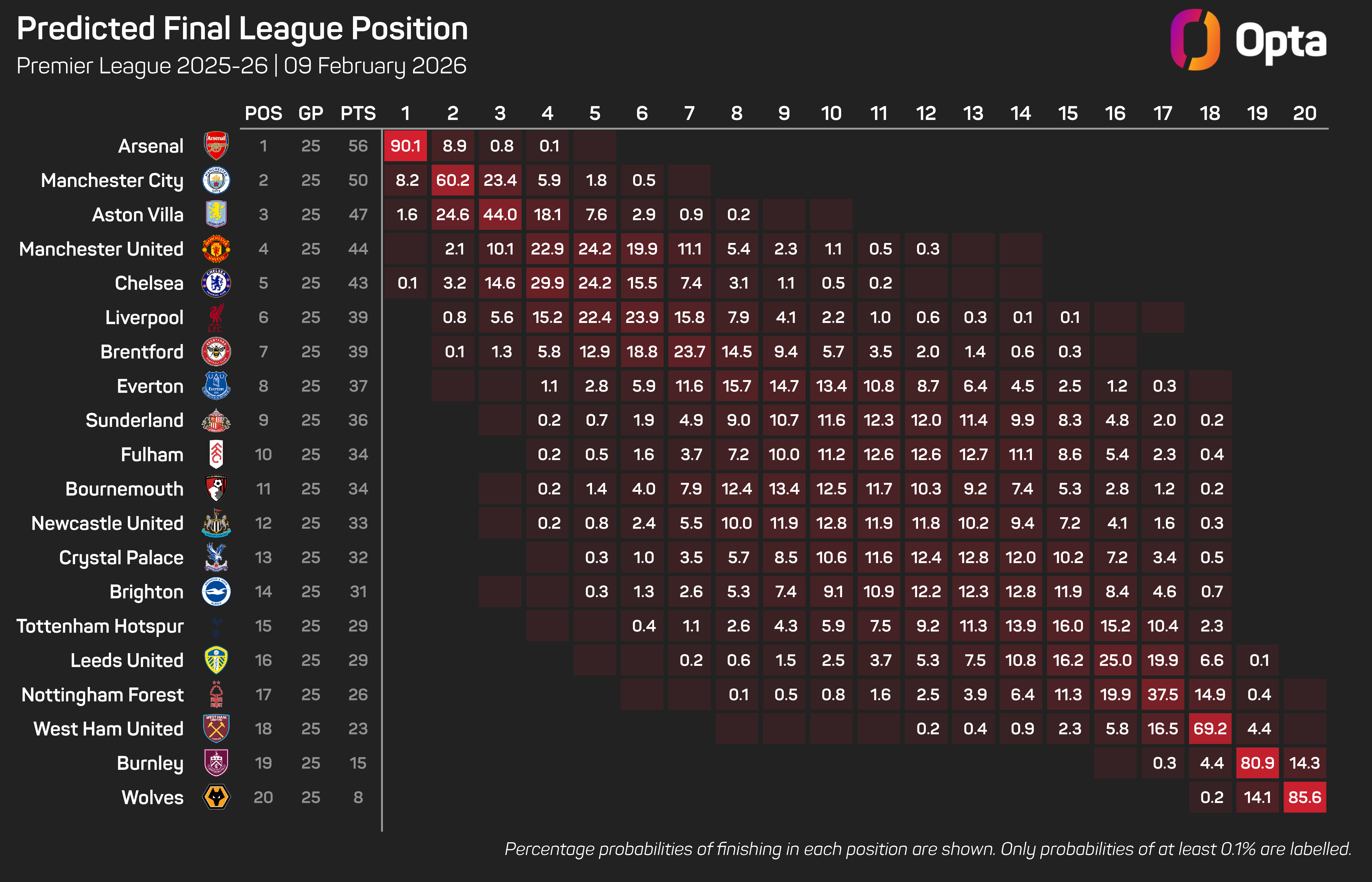 Arsenal remain strong favourites to clinch their first Premier League title since 2003-04, winning 90.1% of the Opta supercomputer's simulations.