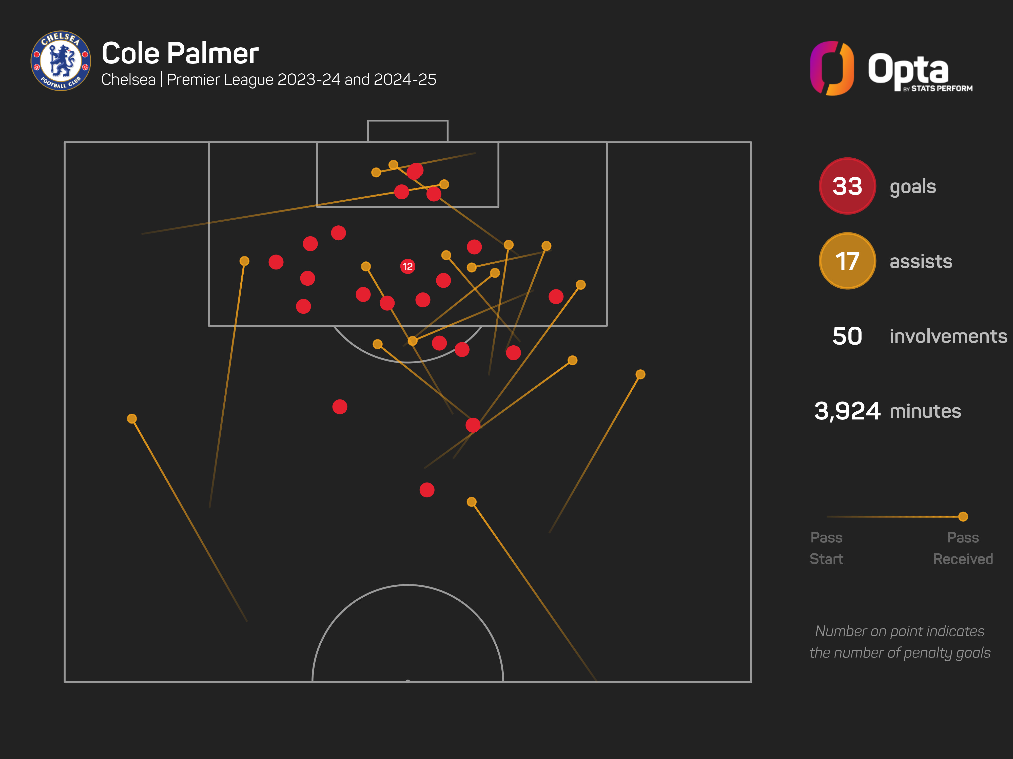 Palmer now has 50 goal involvements (33 goals, 17 assists) in 48 Premier League games for Chelsea, a tally bettered by only three players in the competition's history.