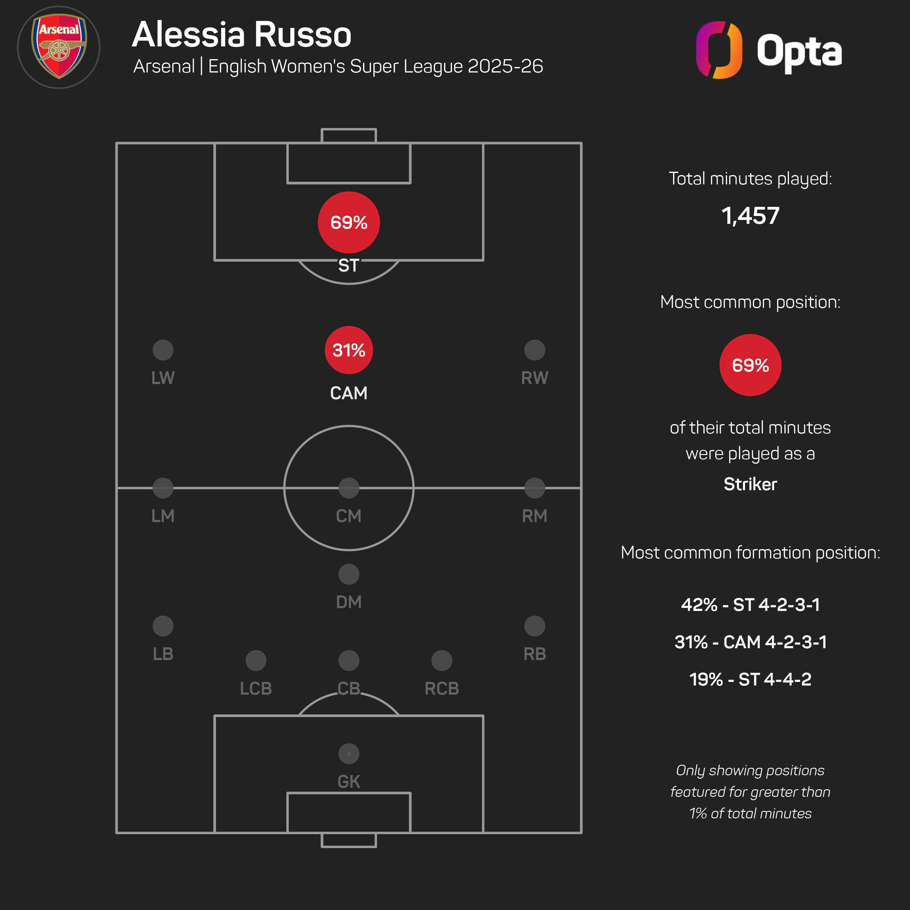 The England international led the line on Saturday, but that has not always been the case this campaign as she has played 31% of her WSL minutes in a number 10 role.