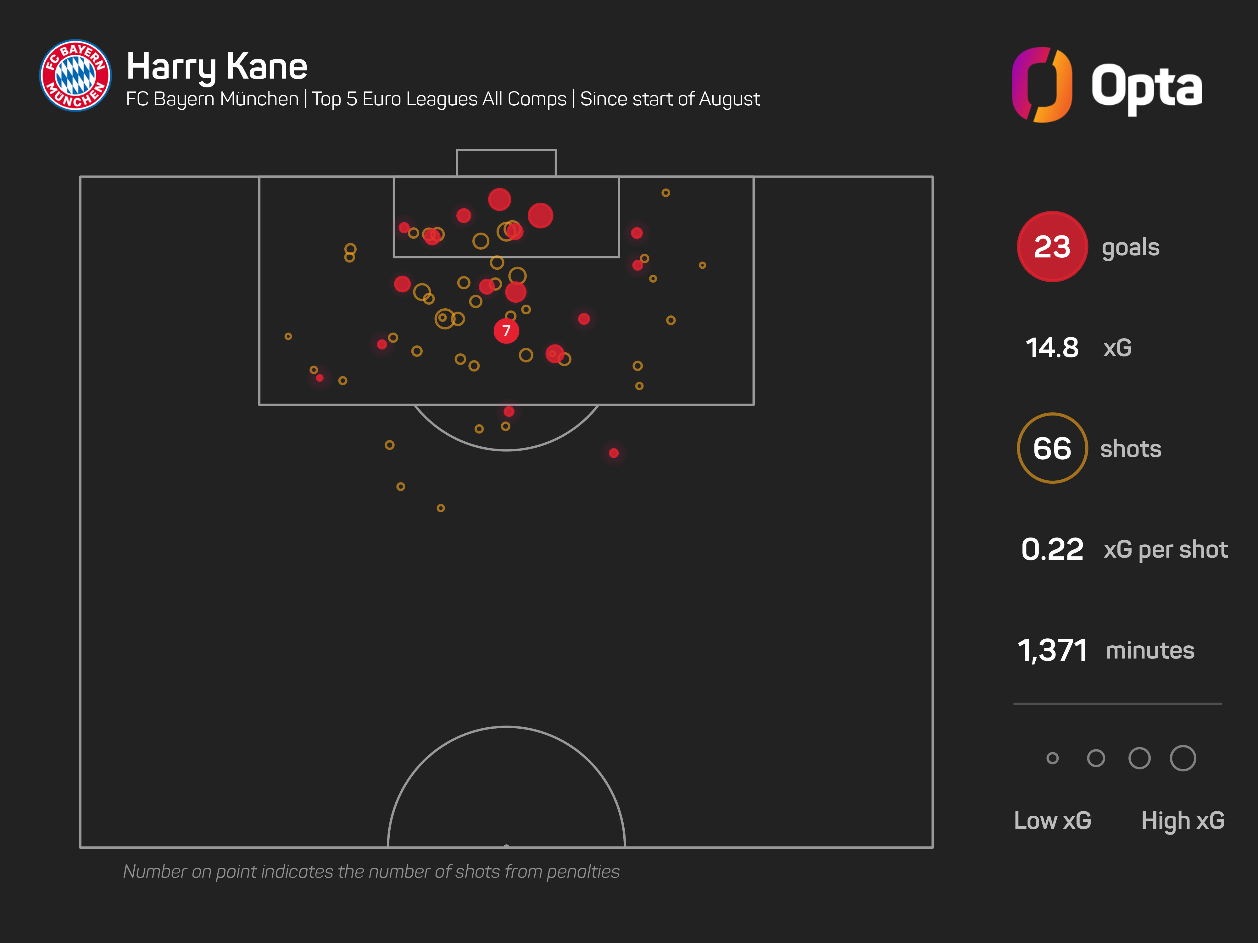 The Englishman's xG overperformance of 8.2 is also the best by any player, while he has converted 16 (59.3%) of his 27 Opta-defined big chances.
