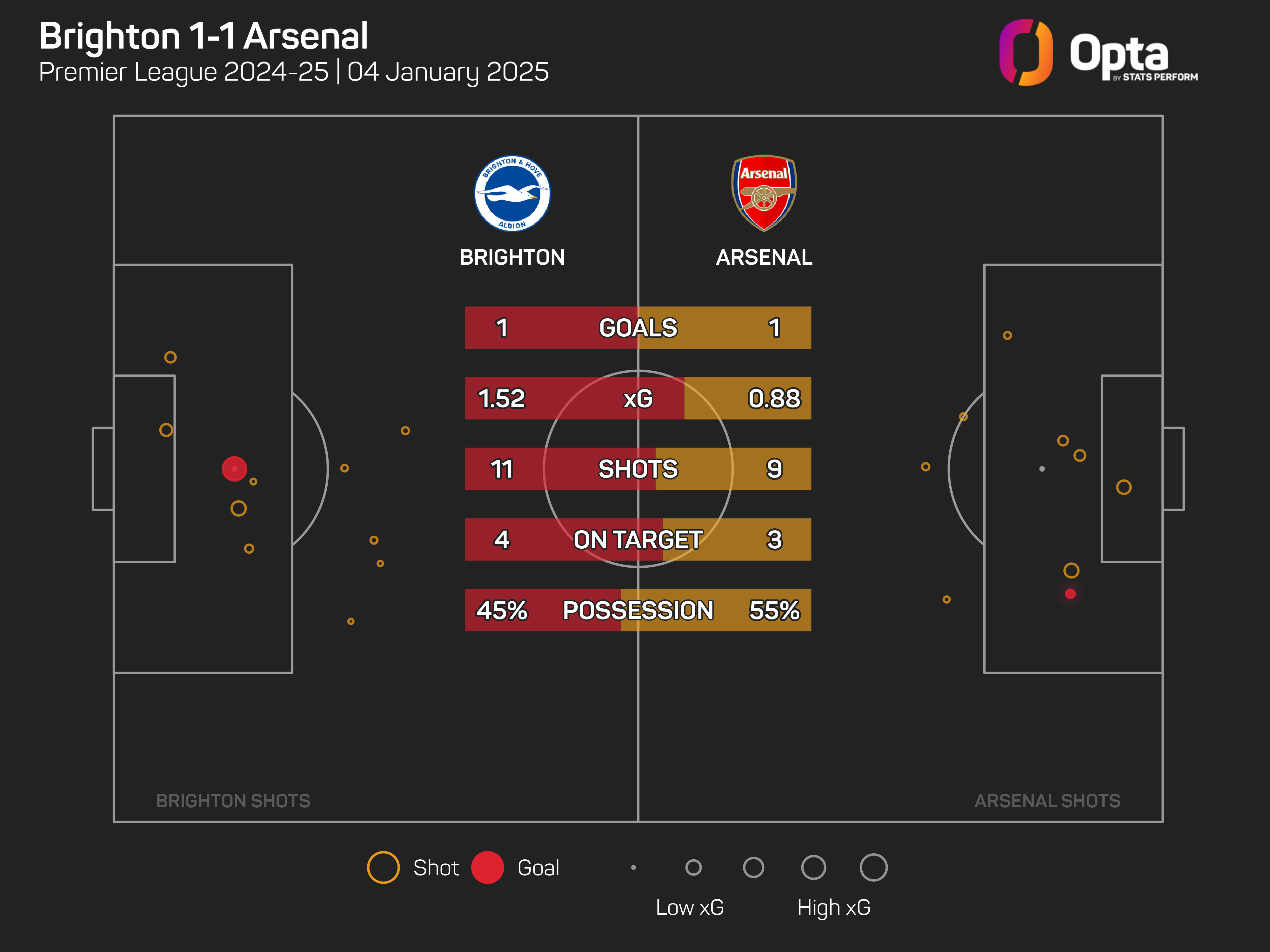 Brighton, on the other hand, finished wi1.52 xG, stepping up their performance and scoring with one of their two 'big' chances (defined as an opportunity from which a player would be expected to score) after the break.