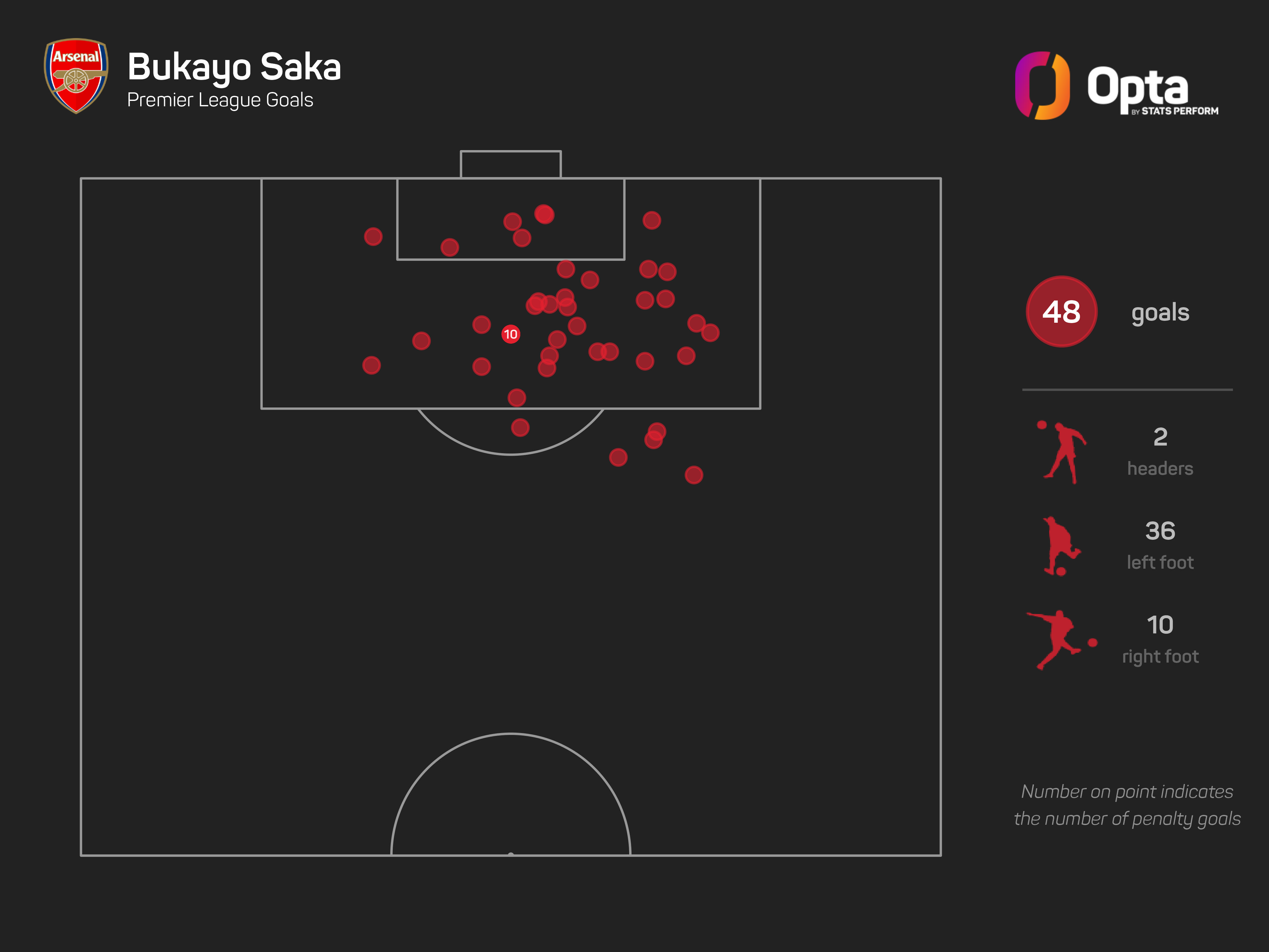 Only Wayne Rooney (22 years, 87 days) and Cesc Fabregas (22 years, 180 days) hit the landmark at a younger age than Saka (22 years, 354 days).