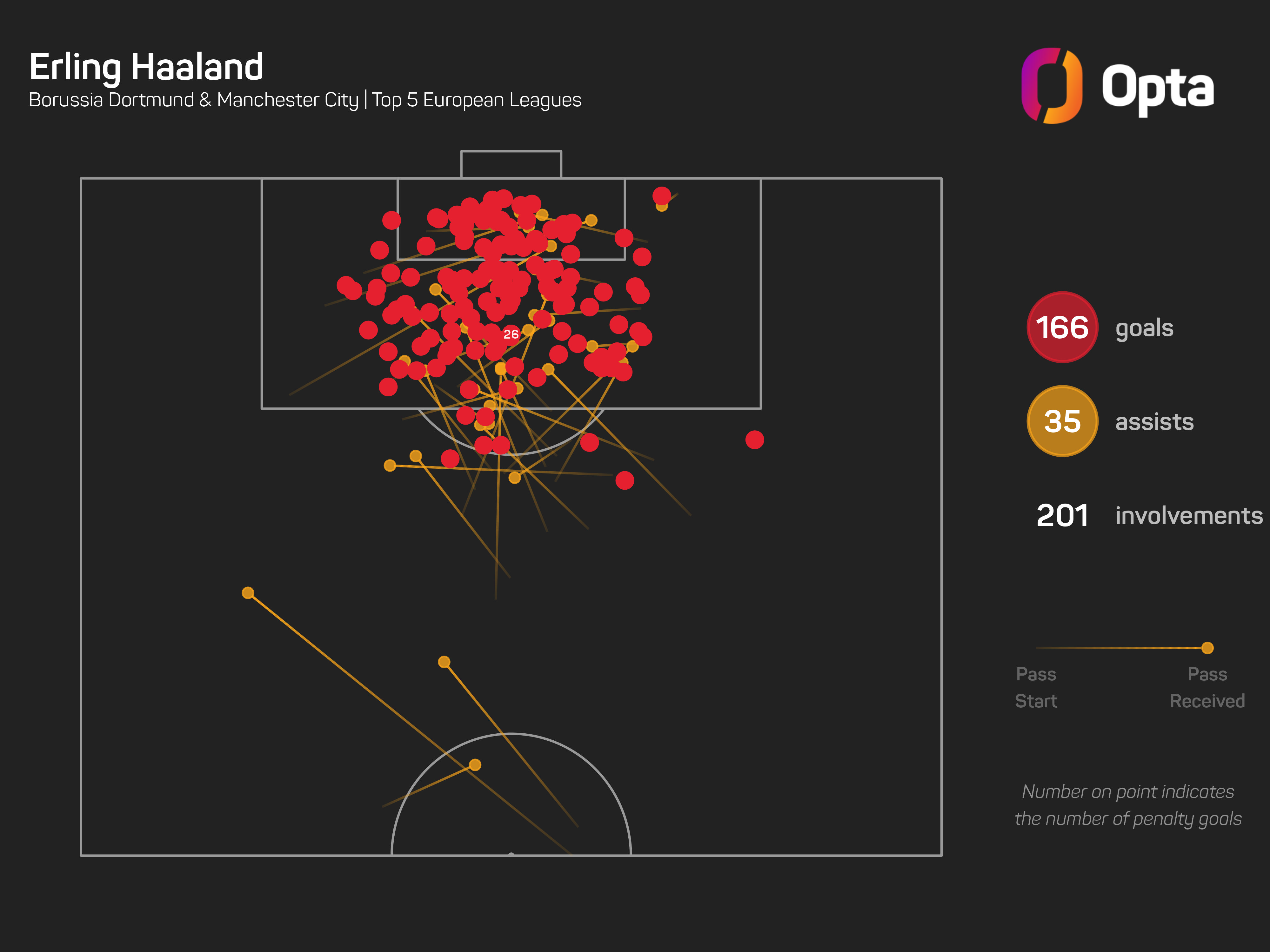 He has hit 104 of those goals in the Premier League, having also netted 62 times for Borussia Dortmund during two and a half seasons in the Bundesliga before his move to England.