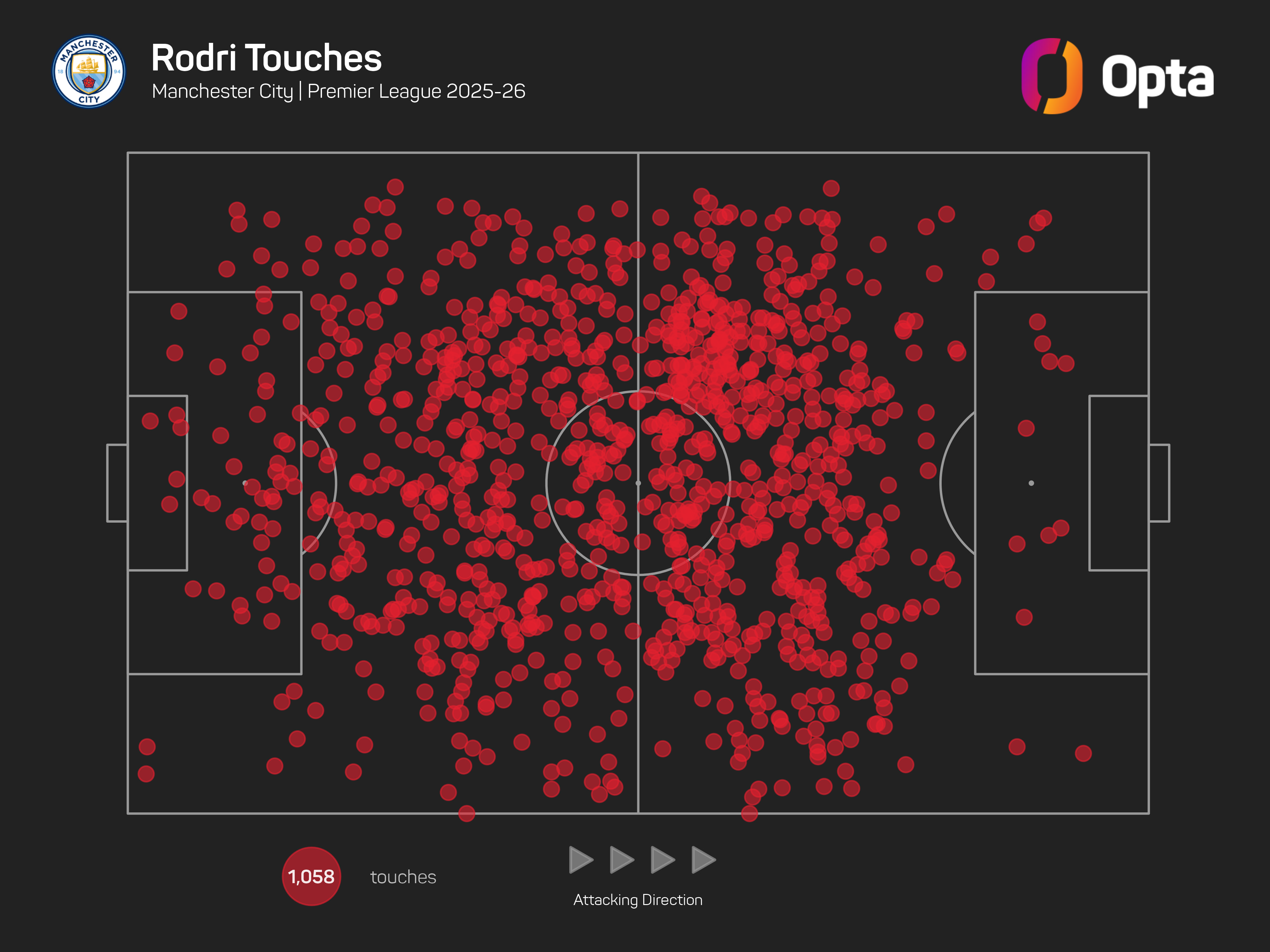 Rodri has made 10 league starts this season, playing 14 times in total.