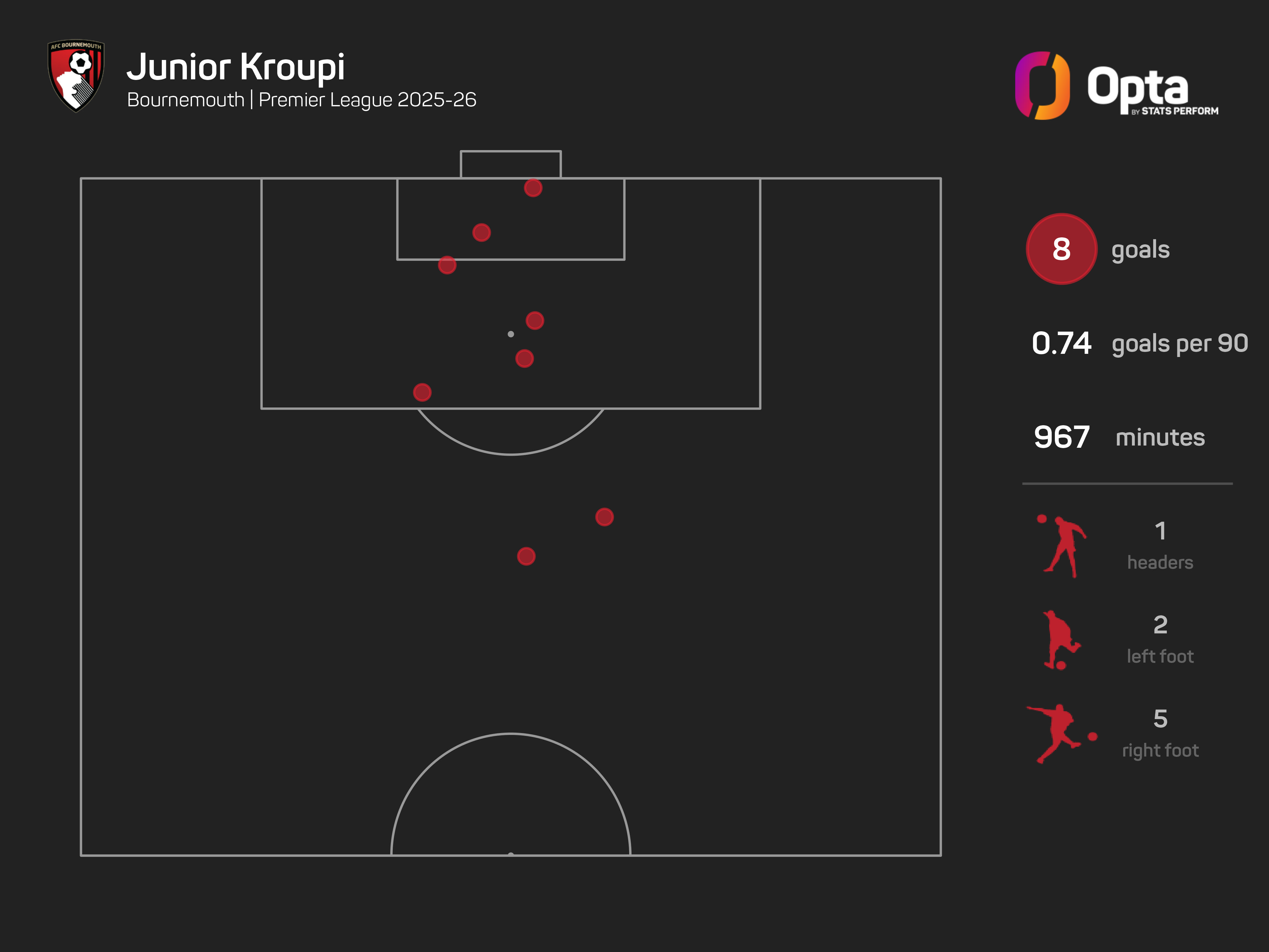 Junior Kroupi has scored eight goals from just 26 shots in the Premier League this season, the best shot conversion rate of any player with 20+ attempts (31%).