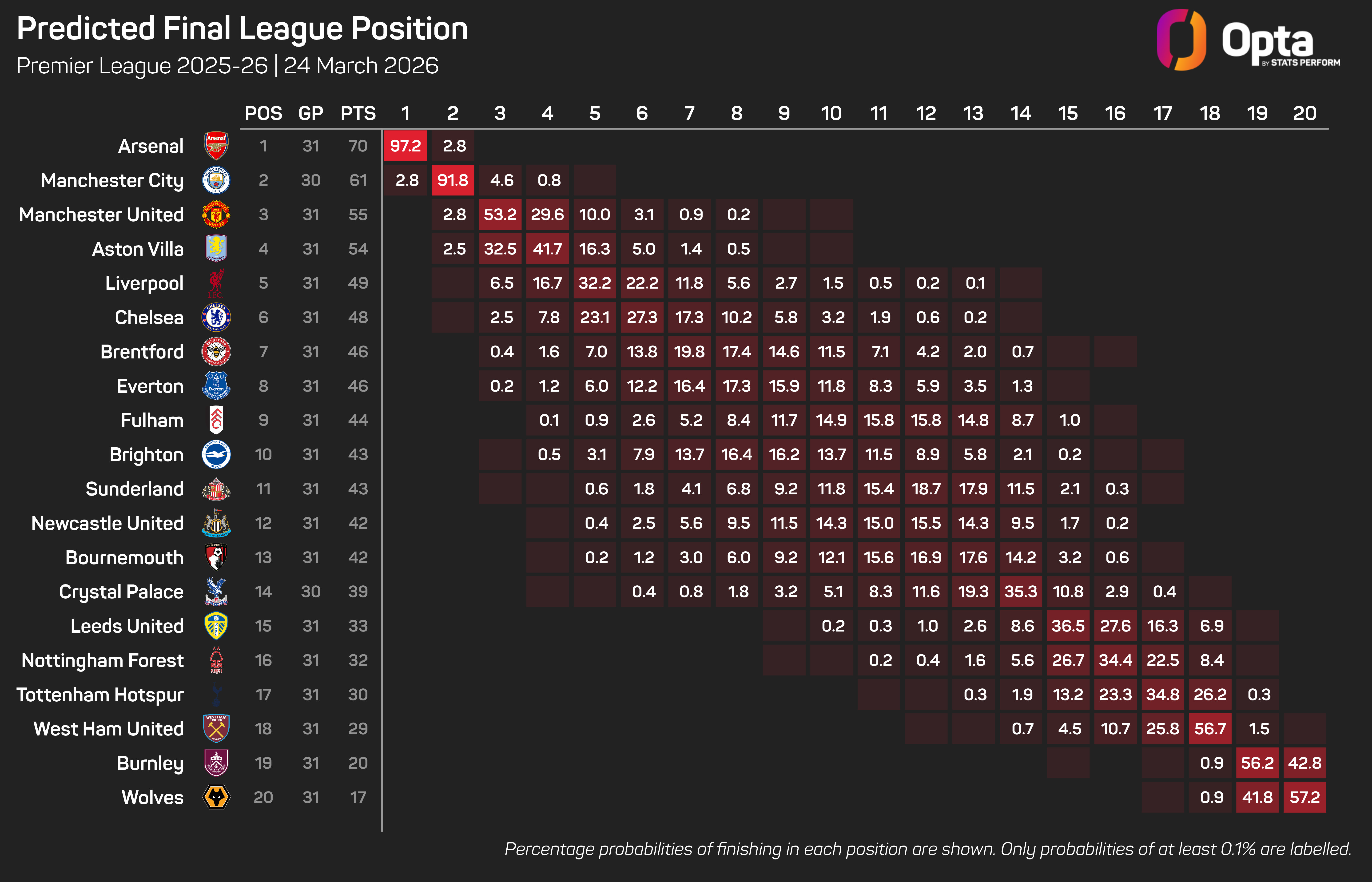 And the Opta supercomputer has assigned Spurs a 26.5% chance of being relegated to the second tier, though their most likely end-of-season position is 17th (38.4%).