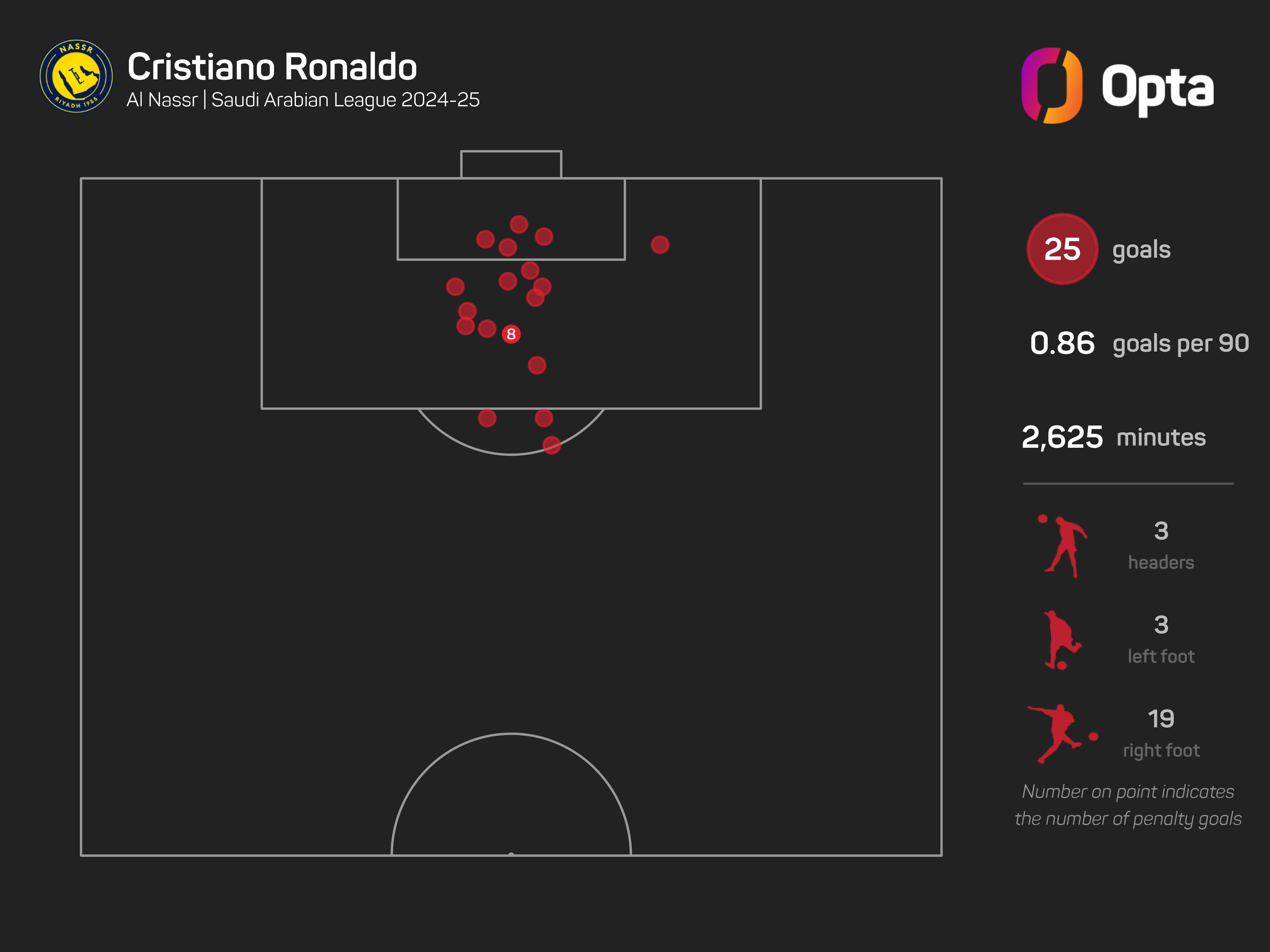 Ronaldo has scored 82 goals in 84 Pro League games for Al-Nassr since joining in January 2023, 28 more than the next-most prolific player in that time (Abderrazzaq Hamed-Allah with 54).