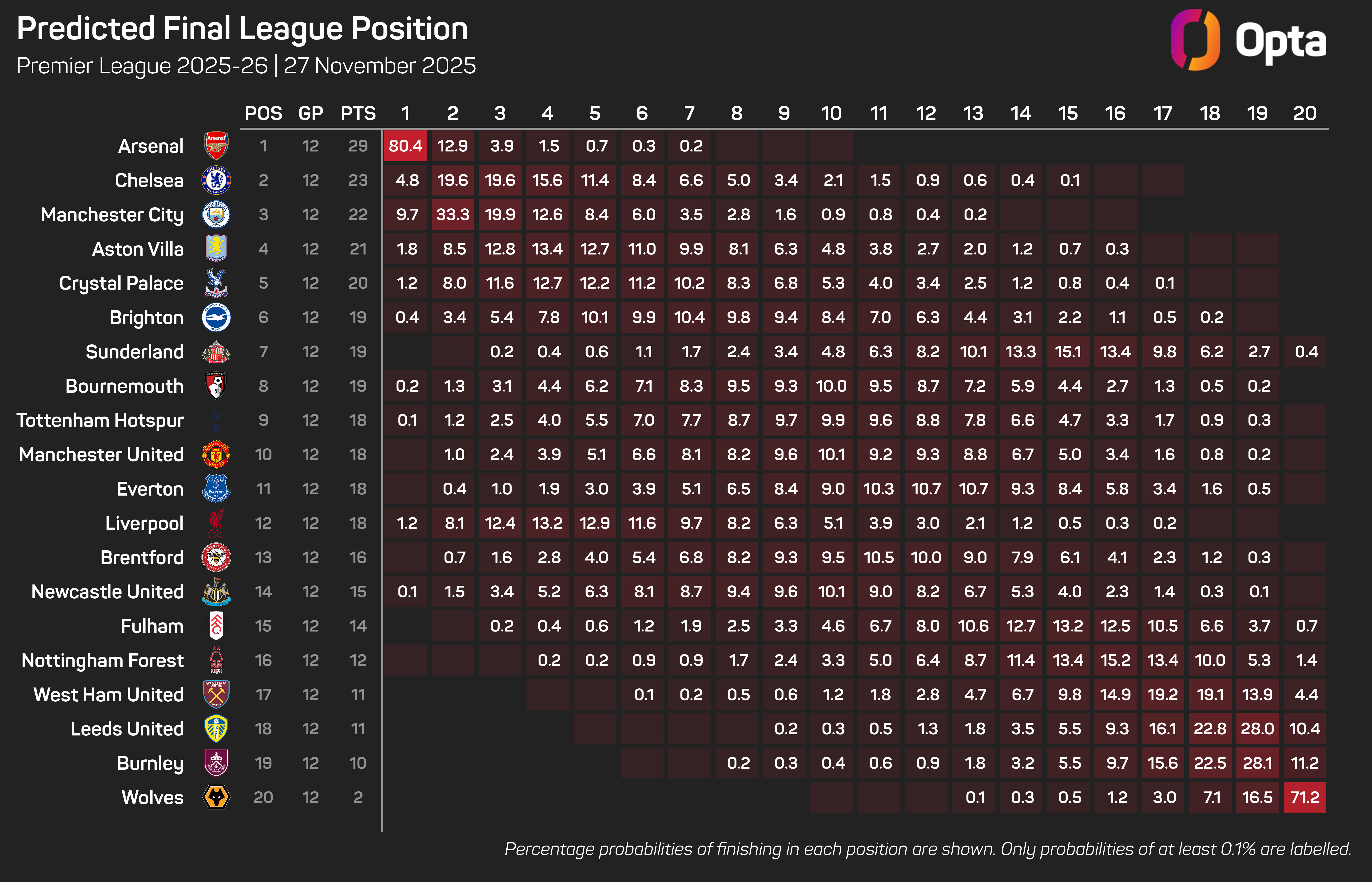 And their dip in form means they are now given just a 1.2% chance of retaining their title by the Opta supercomputer, with the Gunners currently the favourites at 80.4%.