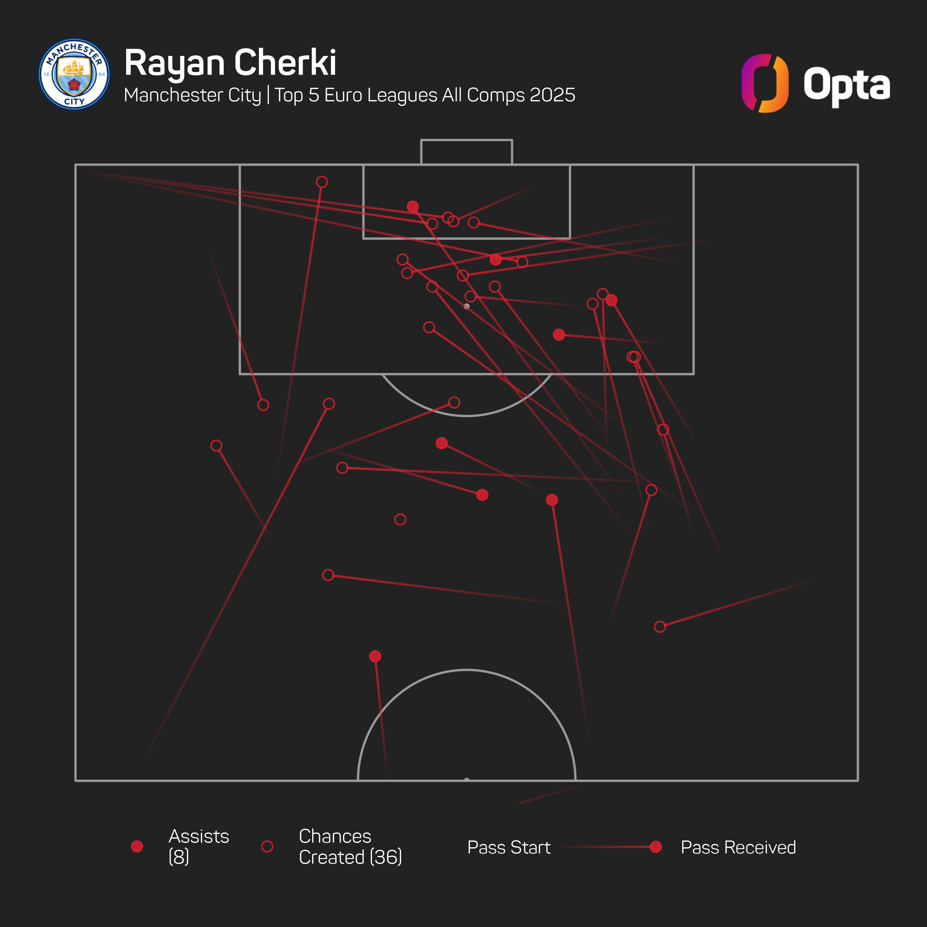 Cherki's 3.24 open-play chances created per 90 minutes in the Premier League, meanwhile, are the second-most of any player to feature for 200 minutes or more this season, after his City team-mate Jeremy Doku (3.44).